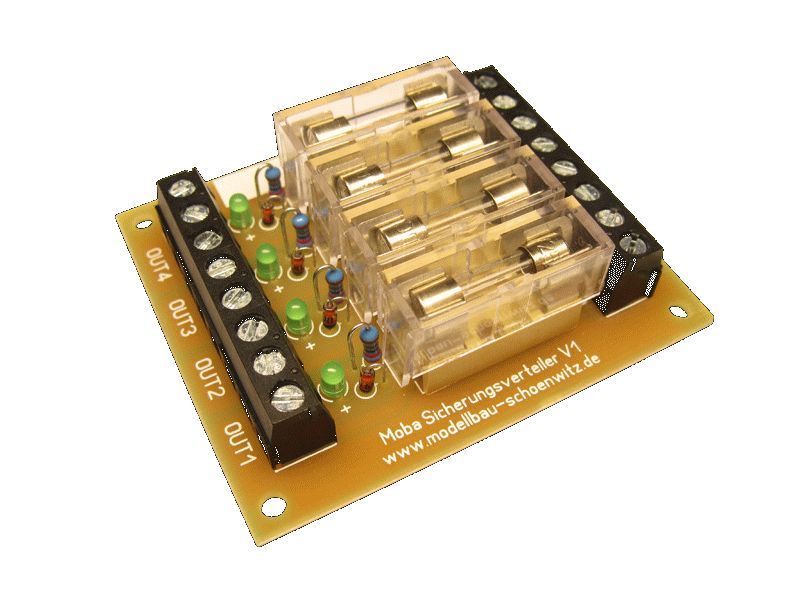 4-fach Modellbahn Moba Sicherungsverteiler V1 mit Feinsicherungen - Der Sicherungsverteiler bietet Ihnen 4 voneinander getrennte und abgesicherte Stromkreise. Schützen Sie Ihre Modellbahn und separieren verschiedene Versorgungsbereiche (Signale / Weichen / Beleuchtung / Fahrstrom). In einem Fehlerfall reduziert sich so die Chance auf einen Kabelbrand* und Sie finden die Fehlerquelle schneller. Ohne, dass Ihre Modellbahn auf einen Schlag ausfällt.Über die vier Status LEDs haben Sich jederzeit einen Überblick, ob die Sicherung ausgelöst hat und der Ausgang mit Spannung versorgt wird.Hierbei handelt es sich um die konventionelle Absicherung mit 4 5x20mm Feinsicherungen ß 500mA Mittelträge.Sollten die Verbraucher anders als mit 500mA Mittelträge abgesichert werden, so können Sie die Sicherungseinsätze bis zu einem Wert von 12A ersetzen.