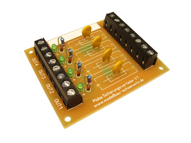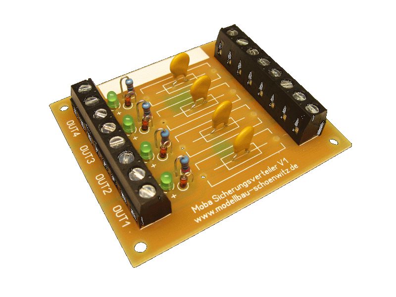 4-fach Modellbahn Moba Sicherungsverteiler V1 mit PTC Sicherungen - Der Sicherungsverteiler bietet Ihnen 4 voneinander getrennte und abgesicherte Stromkreise. Schützen Sie Ihre Modellbahn und separieren verschiedene Versorgungsbereiche (Signale / Weichen / Beleuchtung / Fahrstrom). In einem Fehlerfall reduziert sich so die Chance auf einen Kabelbrand* und Sie finden die Fehlerquelle schneller. Ohne, dass Ihre Modellbahn auf einen Schlag ausfällt.Über die vier Status LEDs haben Sich jederzeit einen Überblick, ob die Sicherung ausgelöst hat und der Ausgang mit Spannung versorgt wird.Hierbei handelt es sich um elektronische PTC Sicherungen, die den Stromkreis bei Überschreiten von 1A unterbrechen und selbstständig bei Unterschreiten von 0,5A den Stromkreis wieder schließen.