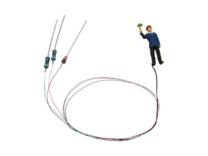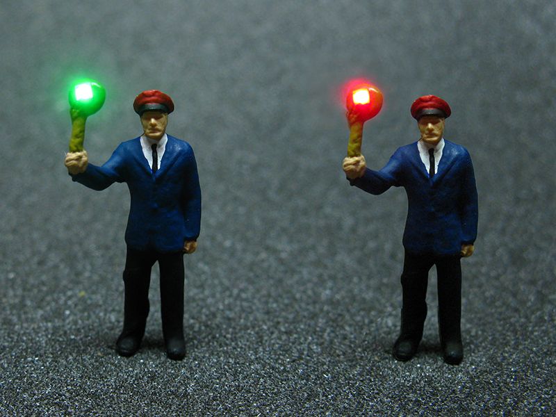 Schaffner mit LED Lichtwechsel Kelle rot - grün H0 - Sie erhalten eine Schaffnerfigur mit einer beleuchteten Kelle, die Sie wahlweise rot oder grün leuchten lassen können. Die Verkabelung zur LED ist fast unsichtbar verbaut und wurde in mühevoller Handarbeit übermalt.