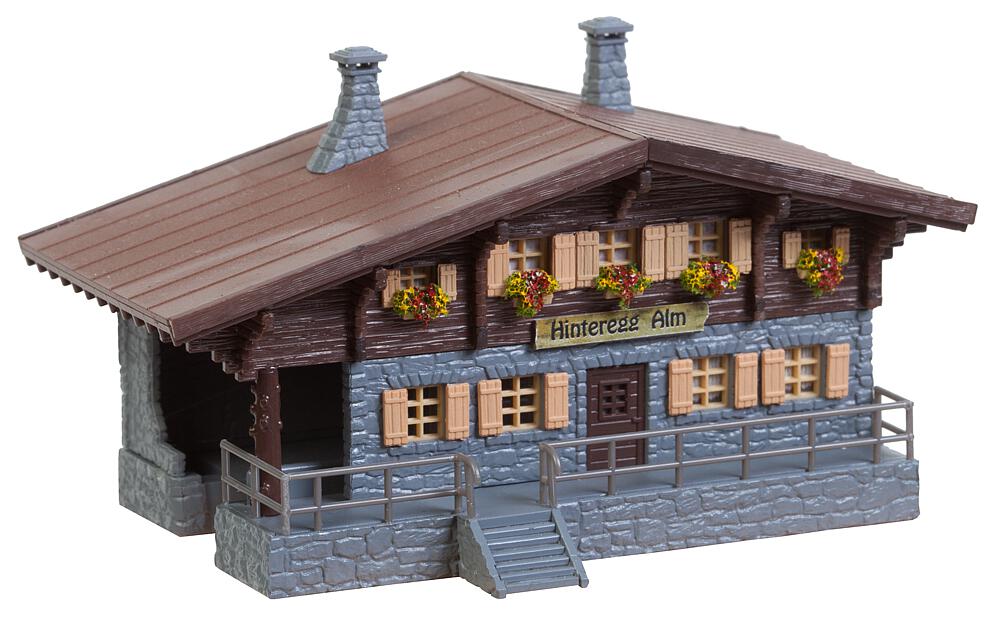 Material- und Personenseilbahn, nebst Berg- und Talstation, mit Antriebsmotor und Steuerung im praktischen Set. Die einspurige Kleinpendelbahn mit geschlossener Gondel dient für den Transport von Gütern oder als Personenzubringer in Höhenlagen. Während die im Lasercutverfahren hergestellte Talstation aus Echtholz und einem Pultdach aus Spezialkarton gefertigt ist, dient eine massive Alpenhütte mit Terrasse und gemauertem Fundament als Bergstation. Zum Zubehör gehören Zaunelemente und ein Gipfelkreuz. Maße: 78 x 63 x 55 mm, 50 x 45 x 40 mm