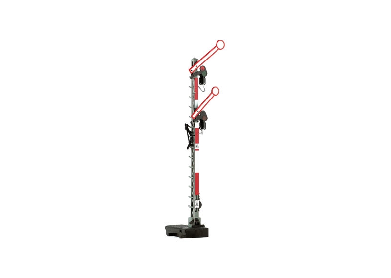 Dieses zweiflüglige Signal ist zur Zugleitung in Bahnhöfen unentbehrlich. Das voll funktionsfähige Modell ist mit zwei beweglichen Signalflügeln und in der Farbe wechselnden Signalleuchten ausgestattet, um "Langsamfahrt" (Hp2) und "Halt" (Hp0) anzuzeigen. Der Mast ist fein detailliert und mit beweglichen Hebeln und Gegengewichten ausgestattet. Mit LGB-Signalantrieb. Einfacher Aufbau und Verkabelung. Zur Verwendung mit LGB 51755 o.ä. Höhe 350 mm.