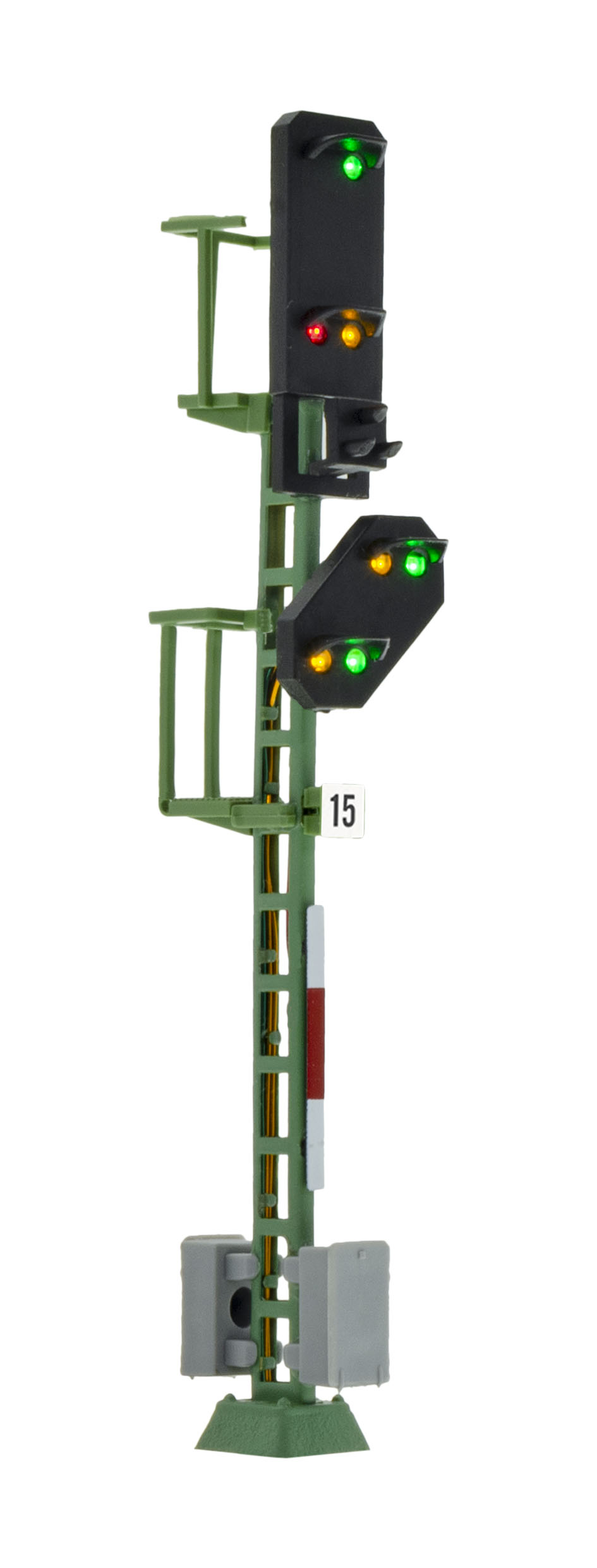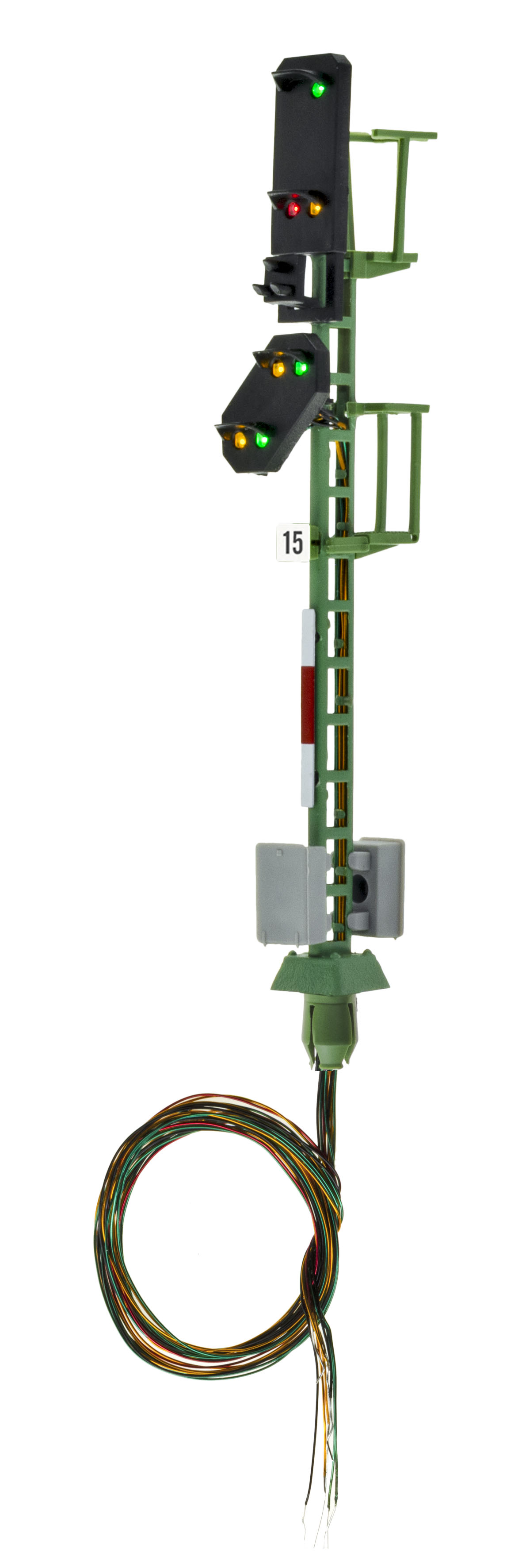 Signal der Einheitsbauart. Messingmast in filigraner Fotoätztechnik hergestellt. Originalgetreue Lackierung. Für alle Analog- und Digitalsysteme geeignet. Mit Patentsteckfuß. Sehr einfache Montage, sehr einfacher Anschluss. Mit 7 LEDs, wartungsfrei. Signalbilder Hp0, Hp1, Hp2, Vr0, Vr1 und Vr2. Passende Steuermodule: Art. 5220 und 5222. Höhe: 7,9 cm.