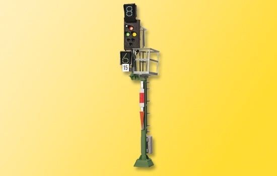 Kombinationssignal mit filigranem Messingmast in originalgetreuer Lackierung. Patentsteckfuß für einfache Montage. Mit Stecker, 6 wartungsfreien LEDs, 2 Geschwindigkeitsvoranzeigern (Zs3 und Zs3v), Vorsignalfunktion