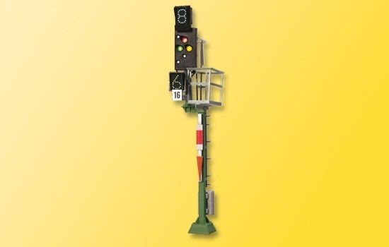 Kombinationssignal mit filigranem Messingmast in originalgetreuer Lackierung. Patentsteckfuß für einfache Montage. Mit Stecker, 8 wartungsfreien LEDs, 2 Geschwindigkeitsvoranzeigern (Zs3 und Zs3v), Vorsignalfunktion