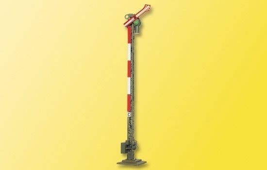 Mit filigranem Gittermast aus Messing in originalgetreuer Lackierung, bedrucktem Signalflügel und Unterflur-Kompaktantrieb mit integrierter Zugbeeinflussung. Wartungsfrei dank LED-Beleuchtung. Signalbilder Hp0 und Hp1. Höhe: 10,3 cm