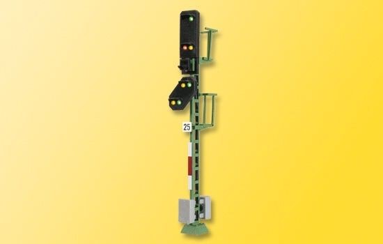 Signal der Einheitsbauart mit filigranem Messingmast in originalgetreuer Lackierung. Wartungsfreie LED-Beleuchtung. Weiße LEDs für den Signalbegriff Sh1 (Rangierfahrt). Genial einfacher und betriebssicherer Anschluss über nur noch eine einzige Steckverbindung. Steuerung über die Multiplexer Art. 5229 bzw. 52292 für analoge (eingeschränkt) und digitale Modellbahnanlagen. Patentsteckfuß für schnelle und einfache Montage. Mit Stecker und 7 LEDs, wartungsfrei. Signalbilder Hp0, Hp1, Hp2, Vr0, Vr1 und Vr2. Höhe: 7,9 cm.