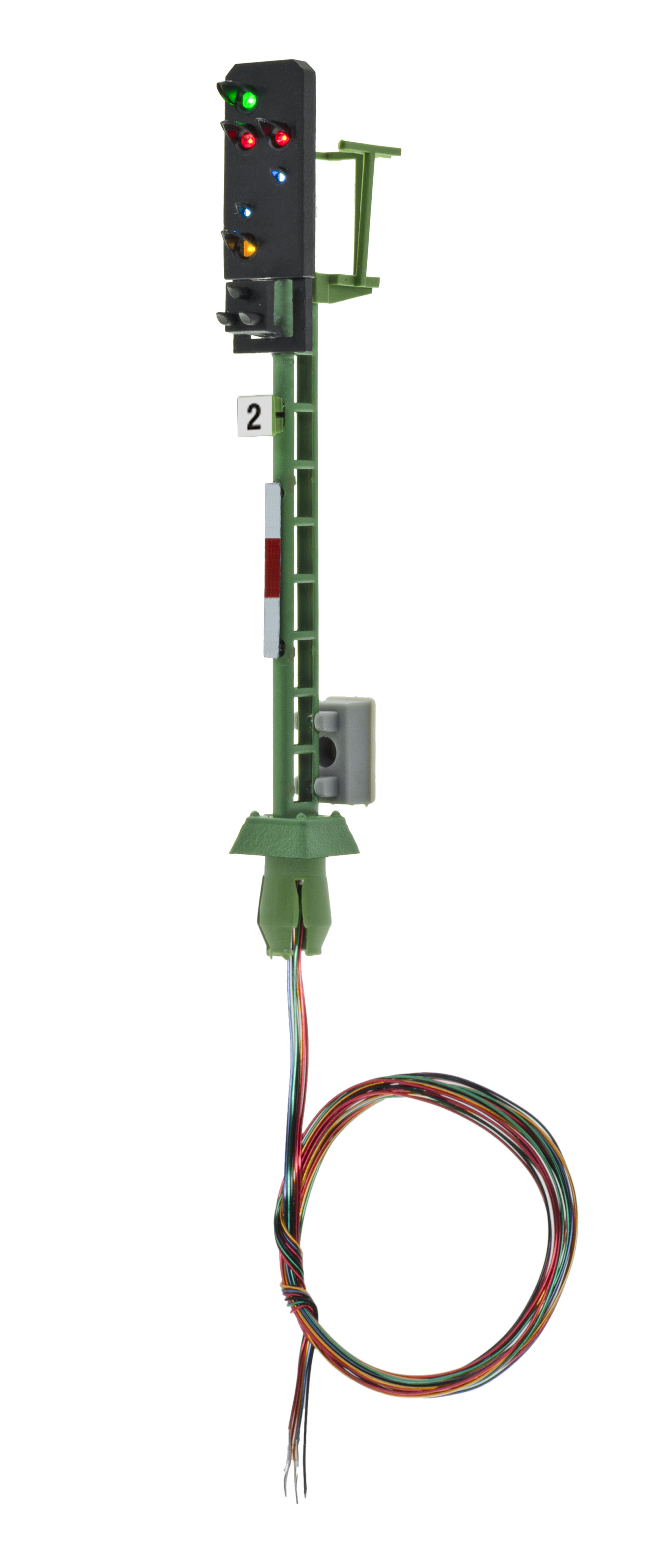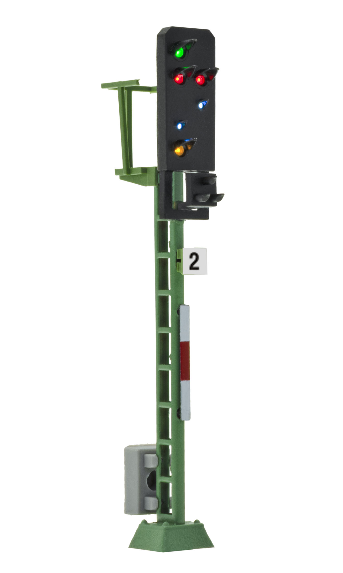 Signal der Einheitsbauart. Filigraner Messingmast in originalgetreuer Lackierung. Patentsteckfuß für einfache Montage. Mit 6 LEDs, wartungsfrei. Signalbilder Hp0, Hp0/Sh1, Hp1 und Hp2. Passendes Steuermodul: Art. 5223. Höhe: 6,1 cm.