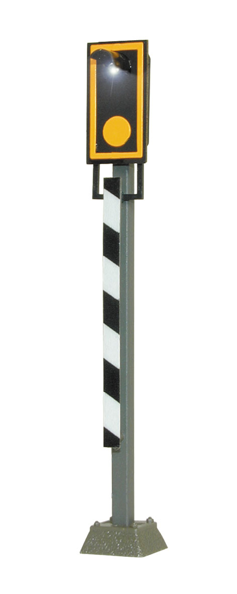 N Blinklicht-Überwachungssignal, modern - Für Bahnübergänge mit Blinklicht. Mit filigranem Messingmast in originalgetreuer Lackierung und Steckfuß für einfache Montage. Zum Anschluss an das Blinkgerät Art. 5065. Mit einer LED, wartungsfrei. Signalbild Bü1. Höhe: 2,9 cm