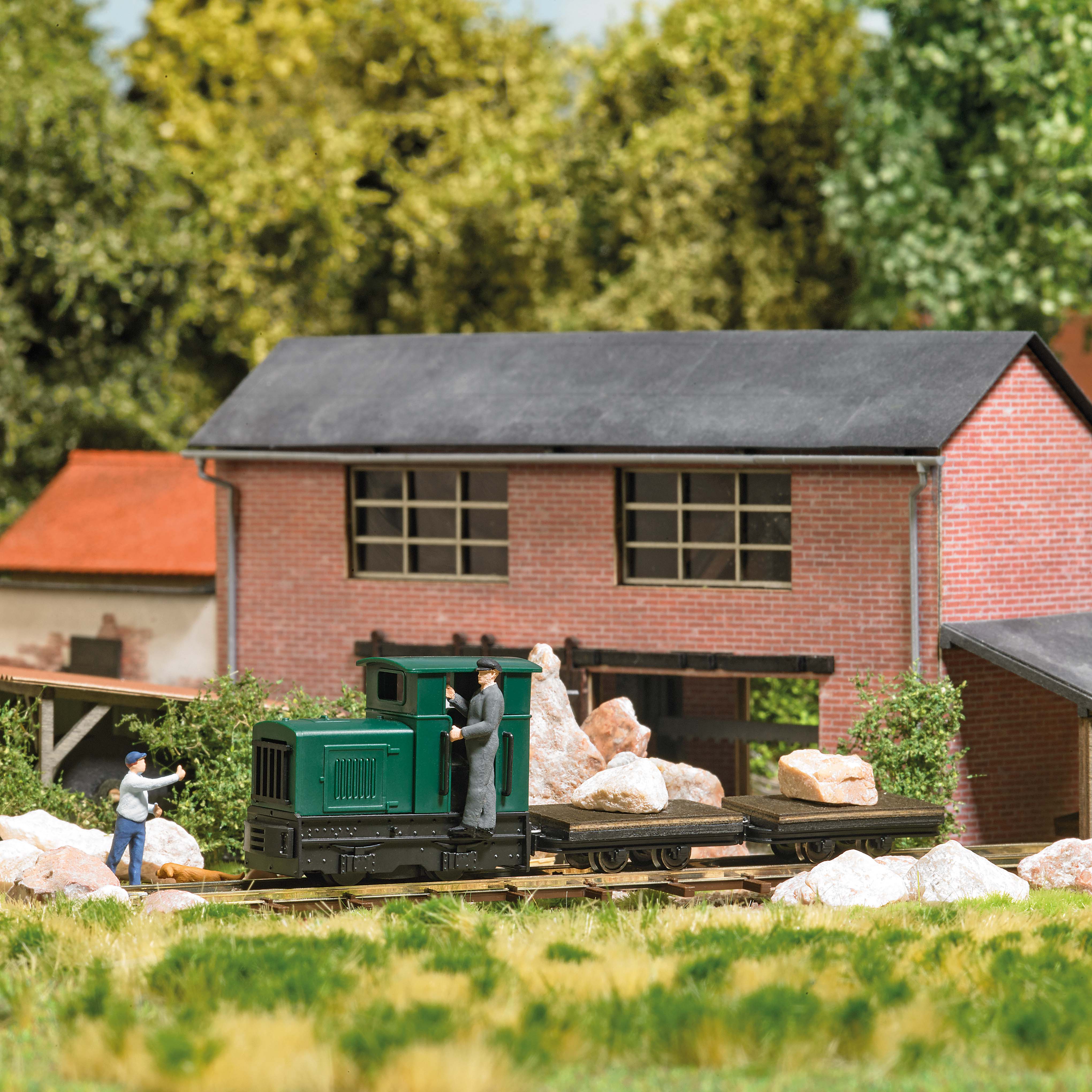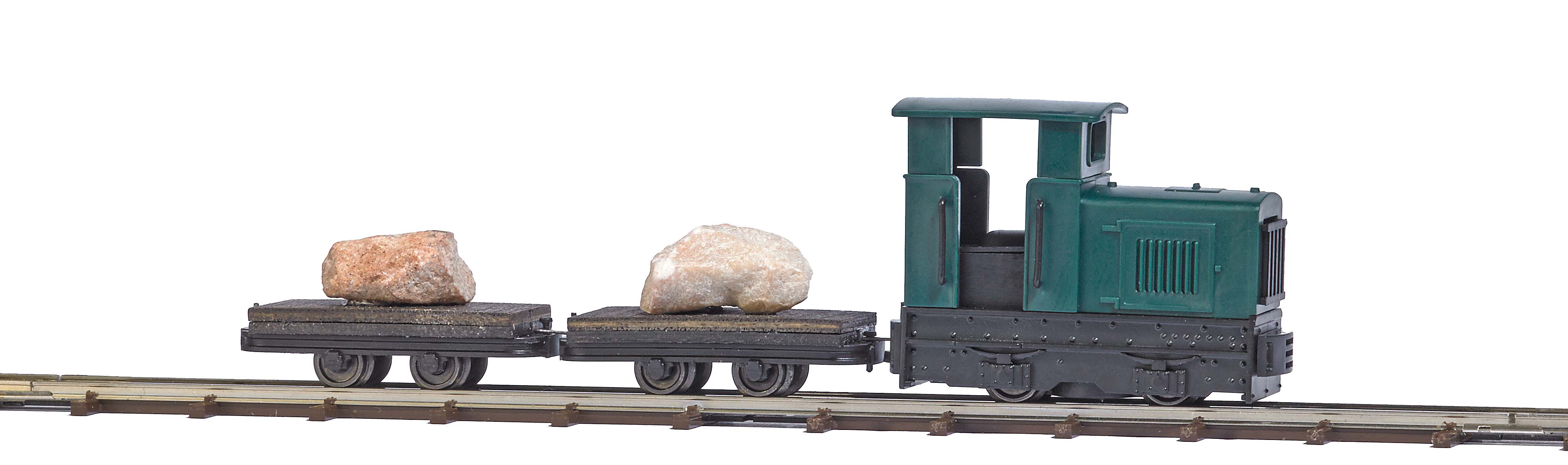 Feldbahndiesellokomotive Gmeinder 15/18 in geschlossener Ausführung und 2 Transportwagen beladen mit Felsbrocken. Wagenböden aus echtem Holz. Inklusive Gleisen, Batteriekasten (für 2 Batterien LR6/AA, nicht enthalten) und Schalter (Vorwarts/Rückwärts/ Stopp).