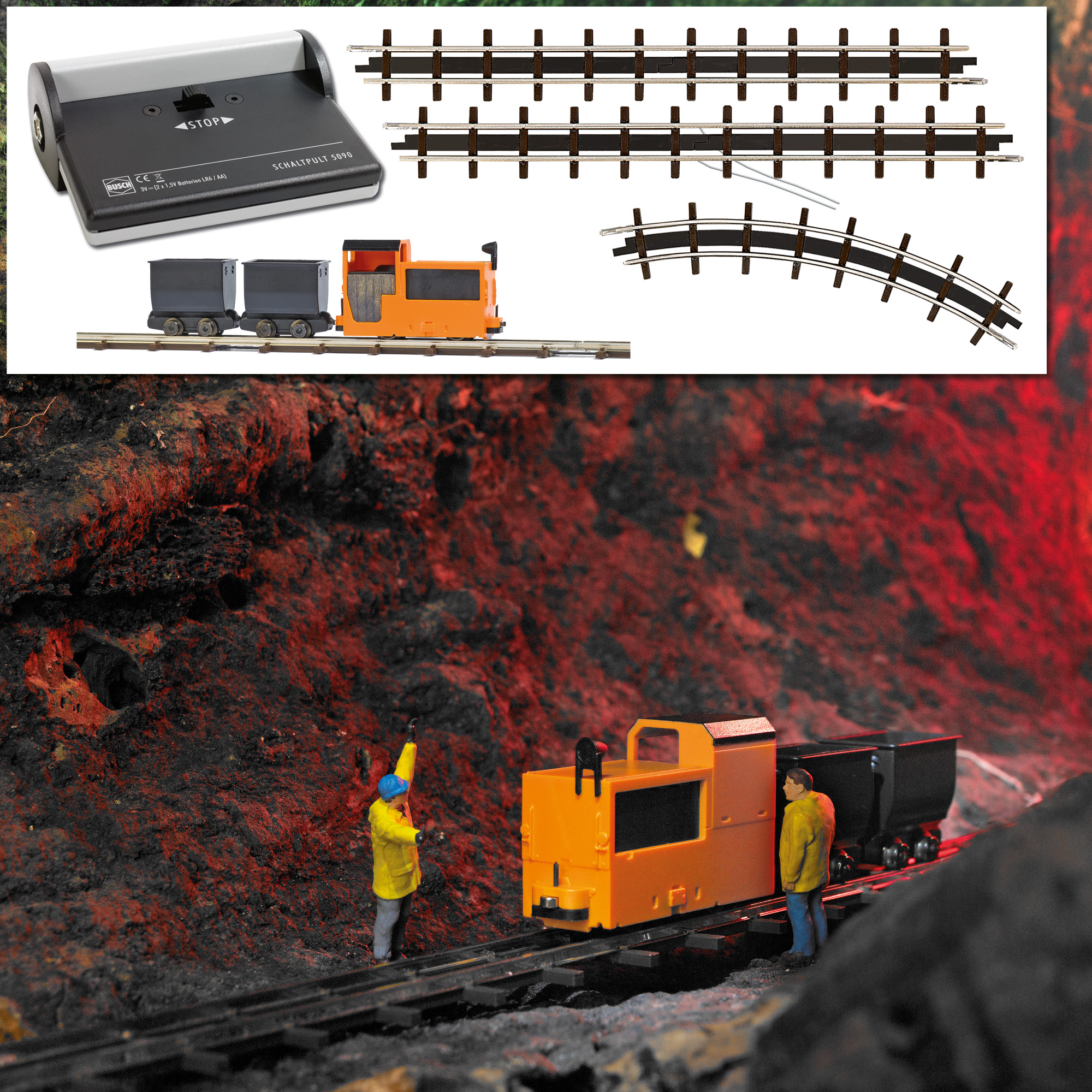 Inhalt: Grubenbahnlokomotive B 360 mit Bergwerksloren. Gleise und Batteriekasten für 2 Batterien LR6/AA (nicht enthalten) und Schalter (Vorwärts/Rückwärts/Stopp).