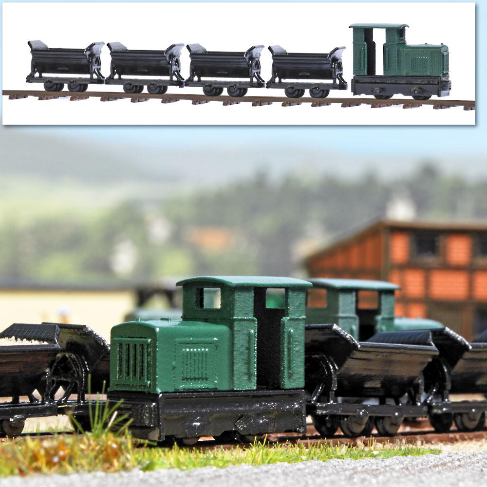 Mit Lokomotive Gmeinder 15/18 (Länge: 19 mm) und 4 Kipploren (ohne Funktion, Länge: 15 mm). Jeweils Standmodelle ohne Antrieb und Kupplungen. Mit den beiliegenden Gleisen (nicht steckbar) lassen sich vielfältige Gleisbilder mit Neben- und Ausweichgleisen gestalten. Inhalt: 18 gerade Gleise, 16 gebogene Gleise, 6 Ausgleichbögen, 3 Weichen links und 3 Weichen rechts.
