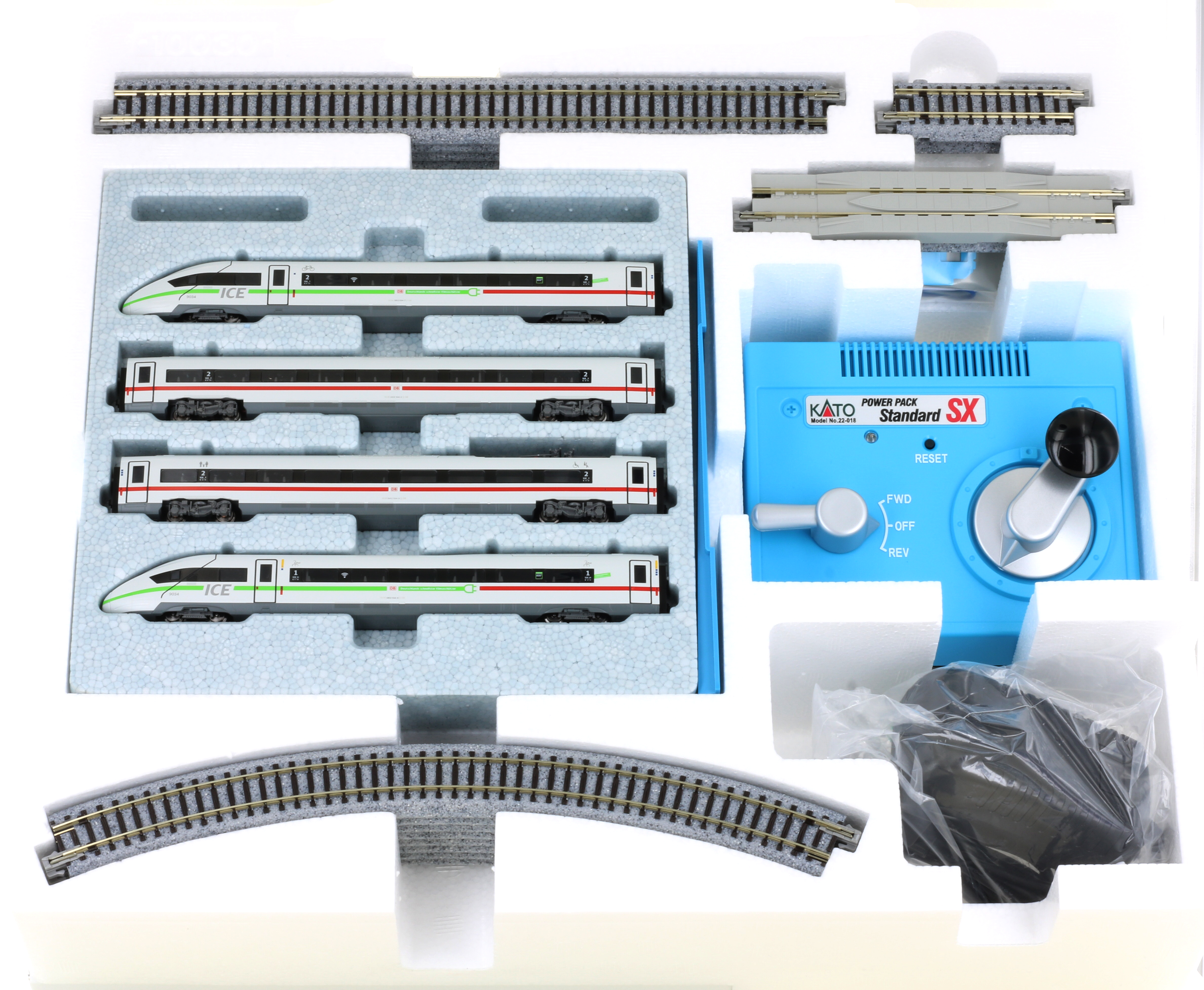 Der ICE verfügt über einen Lichtwechsel weiß/rot und einen kraftvollen fünfpoligen Motor und kann mit den Erweiterungen K10953 und K10954 auf Vorbildlänge gebracht werden. Das Gleisoval hat die Maße 677 x 1337 mm und kann mit den Gleisen aus dem Kato Unitrack-Sortiment ausgebaut werden.