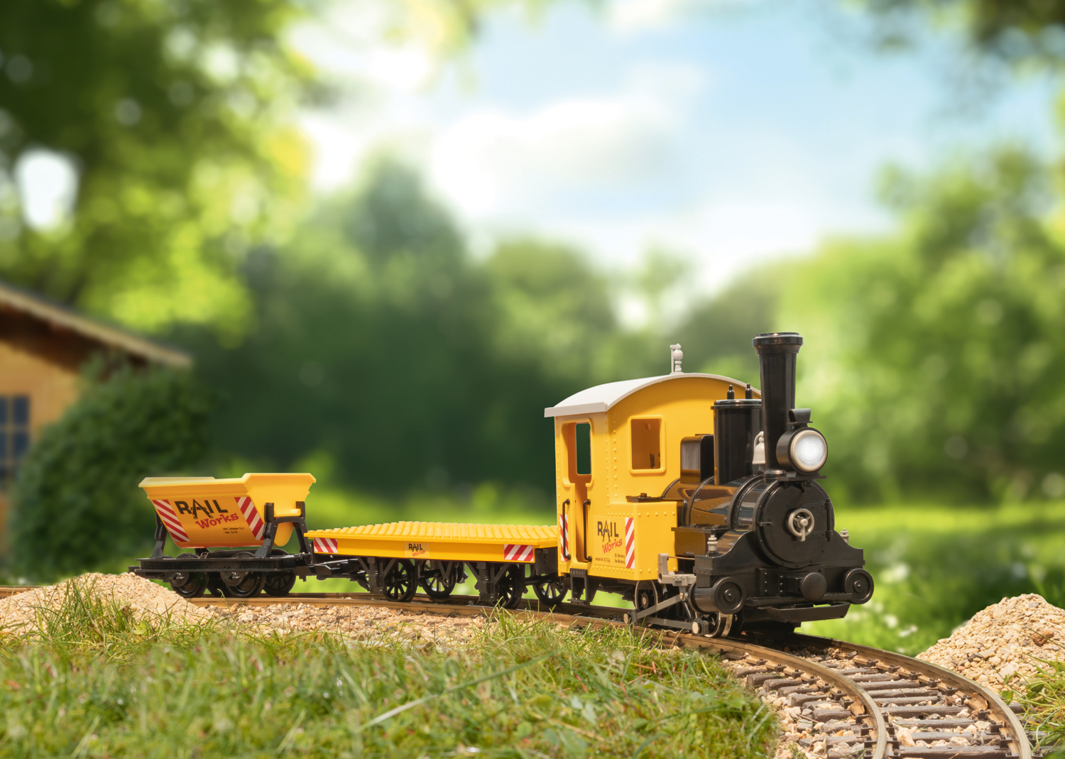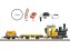 Startset Baustelle Dieses Startset enthält einen Baustellenzug, bestehend aus einer Tenderlok, einem Klemmbausteinwagen und einem Kipplorenwagen. Die Lok ist mit einem leistungsstarken Motor ausgerüstet und verfügt über ein beleuchtetes Spitzenlicht. Mit den beigelegten Stickern können die Lok und beide Wagen dekoriert werden. Das Set enthält zusätzlich einen kompletten Gleiskreis, Stromversorgung für 230 Volt und einen Fahrregler. Zuglänge ca. 70 cm. Unter der Artikelnummer 49501 ist ein Ergänzungsset mit einem weiteren Wagen, einem Bagger und Baustellenzubehör erhältlich.