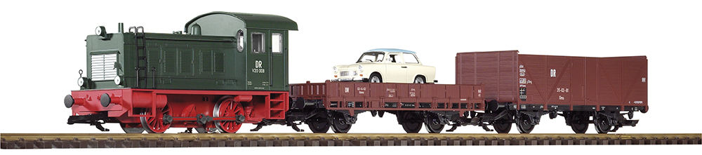 Das Start-Set enthält eine attraktive Diesellok V 20 und 2 Güterwagen in DR Beschriftung. Die kraftvolle Diesellok verfügt über einen fahrtrichtungsabhängigen Lichtwechsel. Die Lok ist bereits mit realistischem,analogem Sound ausgestattet. Die Soundfunktion ist durch zwei beiliegende Schaltmagnete steuerbar. Außerdem besitzt die Lok kugelgelagerte und verchromte Radsätze. Dem Set liegt ein Handentkuppler bei. Er dient dem einfachen Entkuppeln der Fahrzeuge. PIKO G Artikel sind für drinnen und draußen geeignet und tragen zu Recht das Prädikat wetterbeständig. Grundfläche: 120 x 120 cm, Minimale Aufbaufläche: 140 x 140 cm. Inhalt: 1 x Diesellok V 20, 2 x Güterwagen, 12 x 35211 R1 (Bogen R1 600 mm), 1 x 35270 Anschlussklemme, 1 x 35285 Verbindungsclips (14 Stk.), 1 x Fahrregler, 1 x Netzteil (230V) 20V / 32 VA DC/AC, 2 x 35268 Schaltmagnete, 1 x 36039 Handentkuppler.