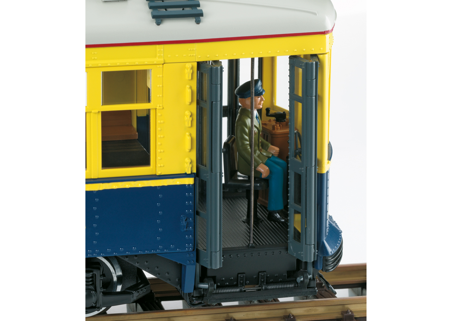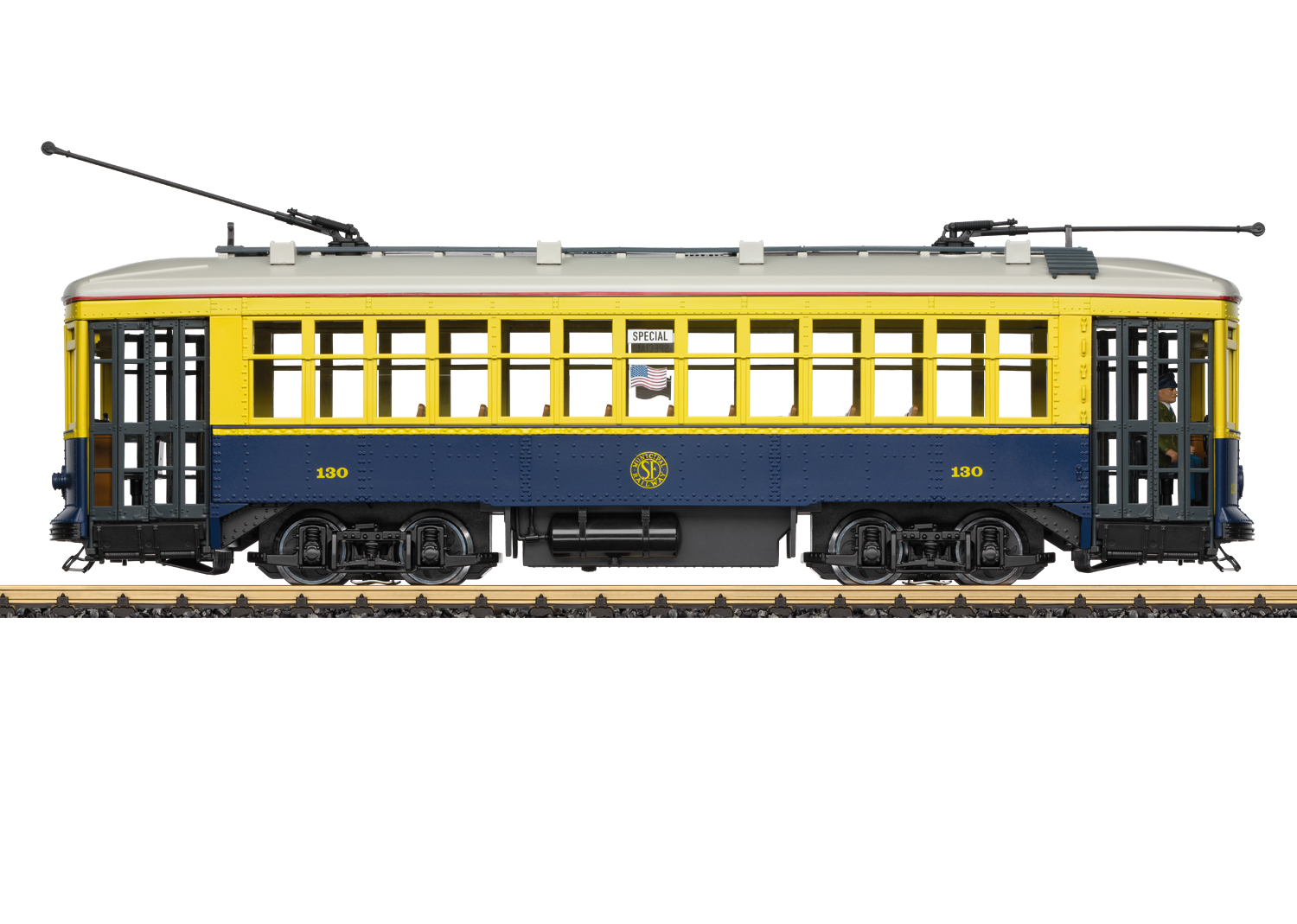 Straßenbahn No. 130 San Francisco - Modell: Modell eines amerikanischen vierachsigen Straßenbahnwagens, wie er heute noch bei der Muni in San Francisco mit der Betriebsnummer 130 im Einsatz ist. Originalgetreue Farbgebung und Beschriftung der Epoche VI. Alle Radsätze mit zwei leistungsstarken kugelgelagerten Bühler-Motoren angetrieben, Haftreifen. Ausgerüstet mit einem mfx/DCC-Decoder mit vielen digital schaltbaren Licht- und Soundfunktionen. Fahrgeräusch analog funktionsfähig. Türen zum Öffnen, dabei klappen die Trittbretter herunter. Länge 55 cm. Stickerbogen mit verschiedenen Zielschildern beigelegt. Erstmals mit Decoder und Sound