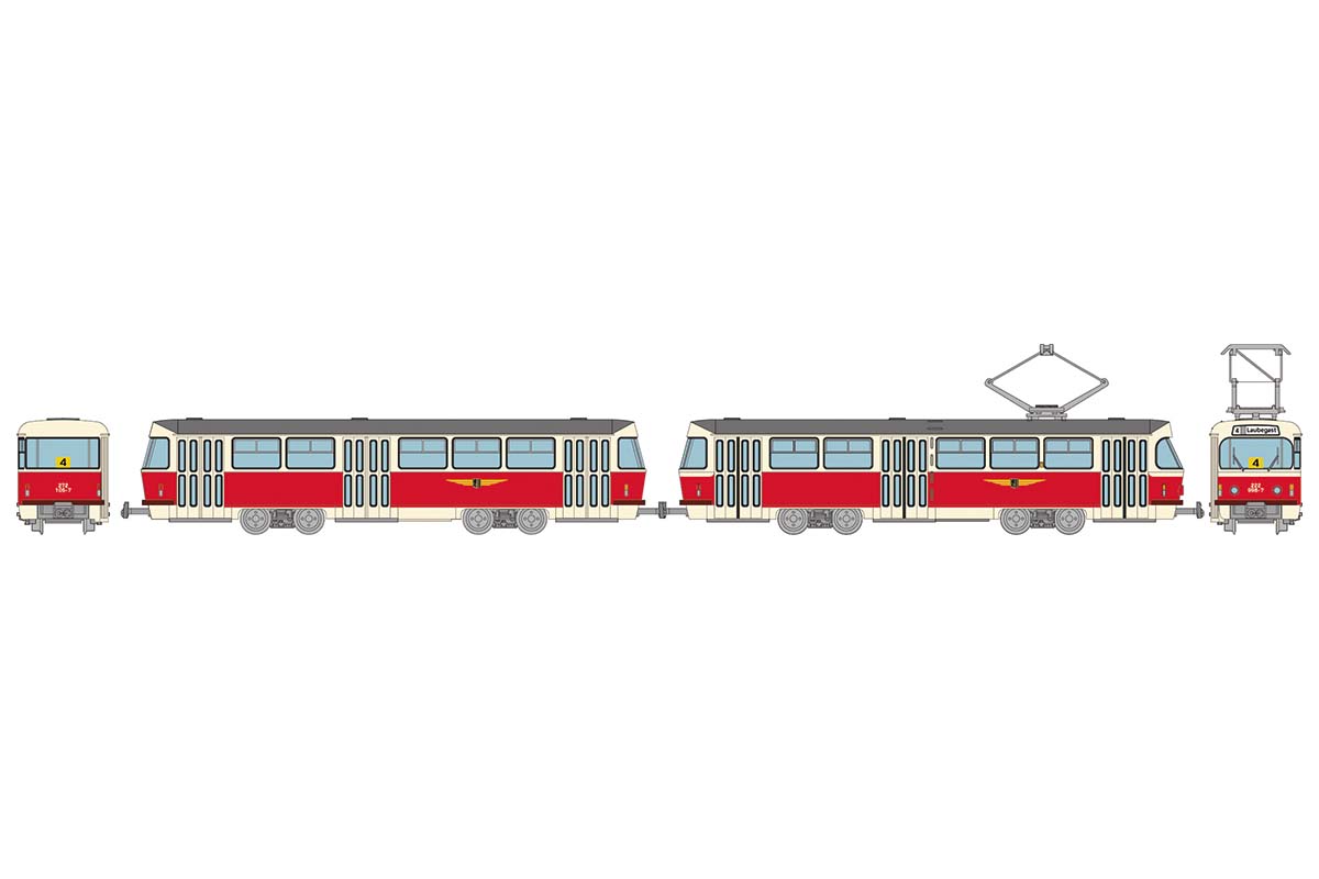 Tram-system, Dresdner Straßenbahn, Typ Tatra T4-B4. Standmodell eines Straßenbahnwagens der Marke Tatra, Set mit 2 Wagen, Triebwagen Typ T4 und Anhänger B4, hier in den Farben der Dresdner Verkehrsbetriebe. Dresden, Landeshauptstadt des Freistaates Sachsen in Ostdeutschland hat ein Streckennetz von rund 130 Kilometer. Das Modell beinhaltet den Antrieb TM-TR0 zur Motorisierung.