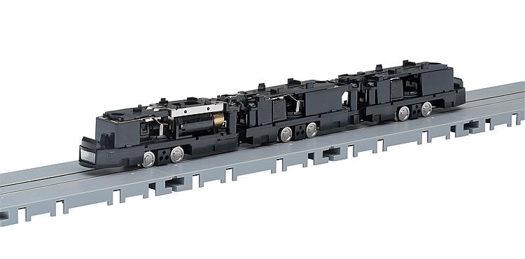 Motorisiertes Fahrgestell TM-LRT04, für Dreier-Züge, Trams. Motorisiertes Fahrgestell für die Tram-Standmodelle mit drei Wagen. Radabstand 118,2 mm, Achsenabstand 12 mm. Nicht geeignet für Super Mini Tracks.