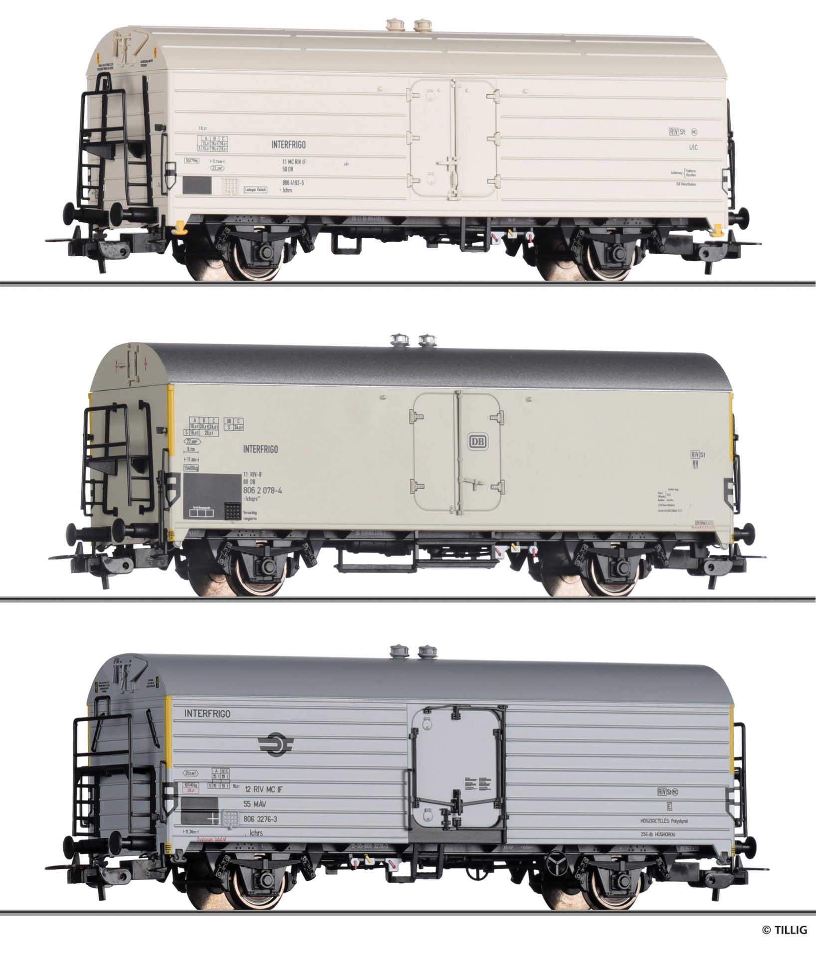 Güterwagenset "INTERFRIGO" bestehend aus drei Kühlwagen der DR, DB und MAV, für die Epoche 4.