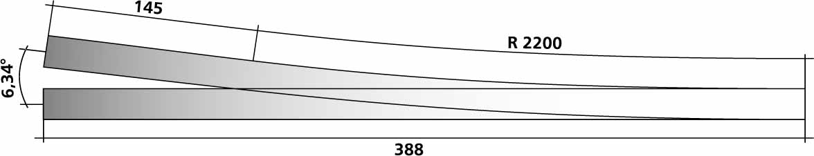 Hand-Weiche rechts, Herzstückwinkel 6,3°, Abzweig 6,34°, Radius 2.200,Länge 388mm.