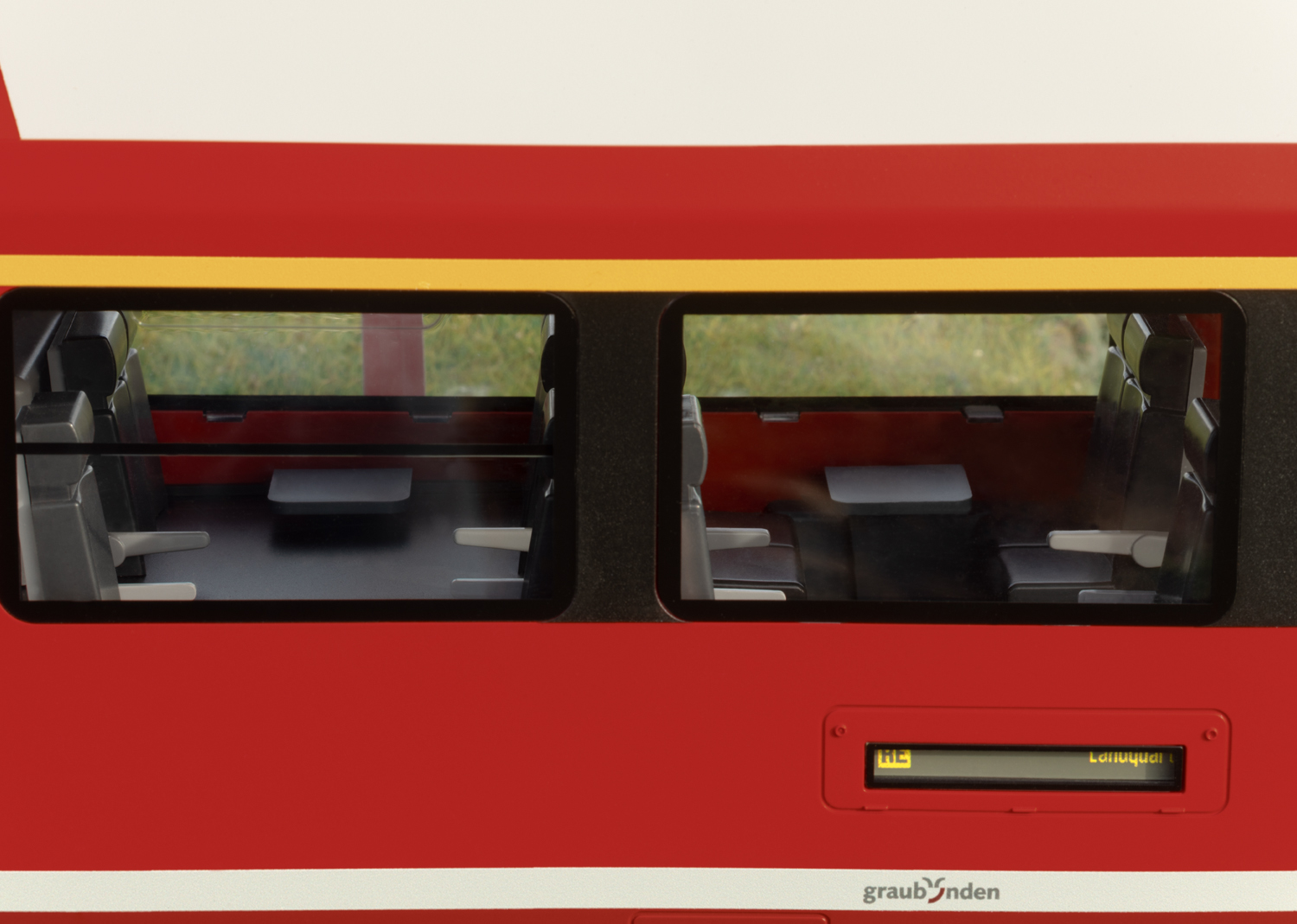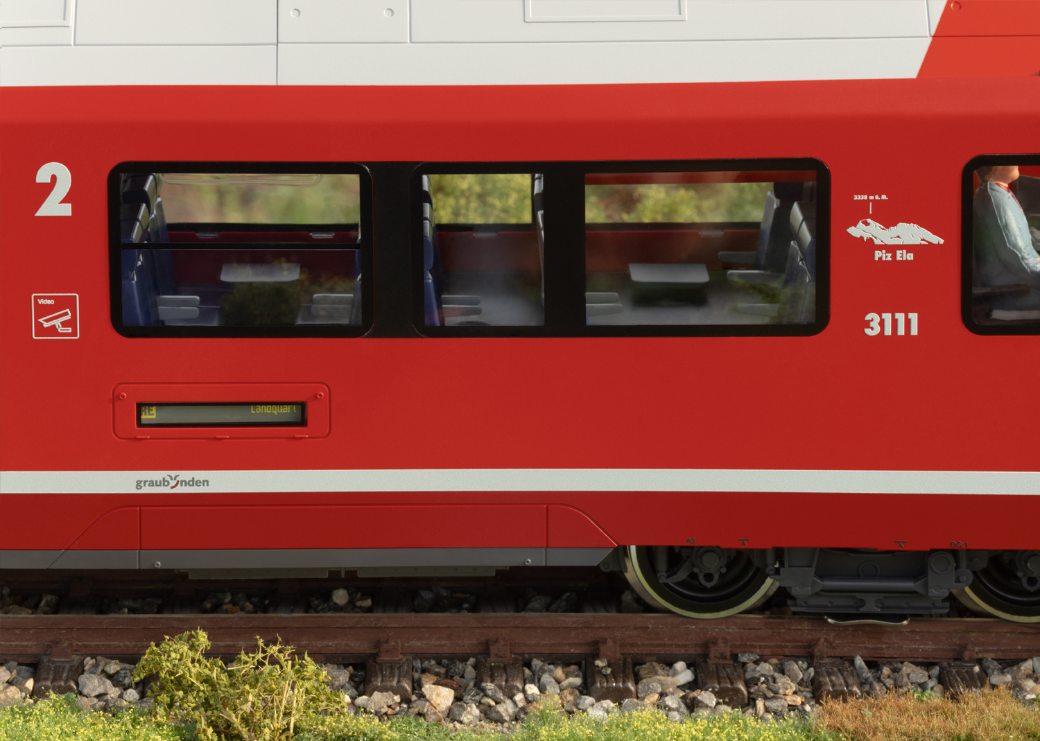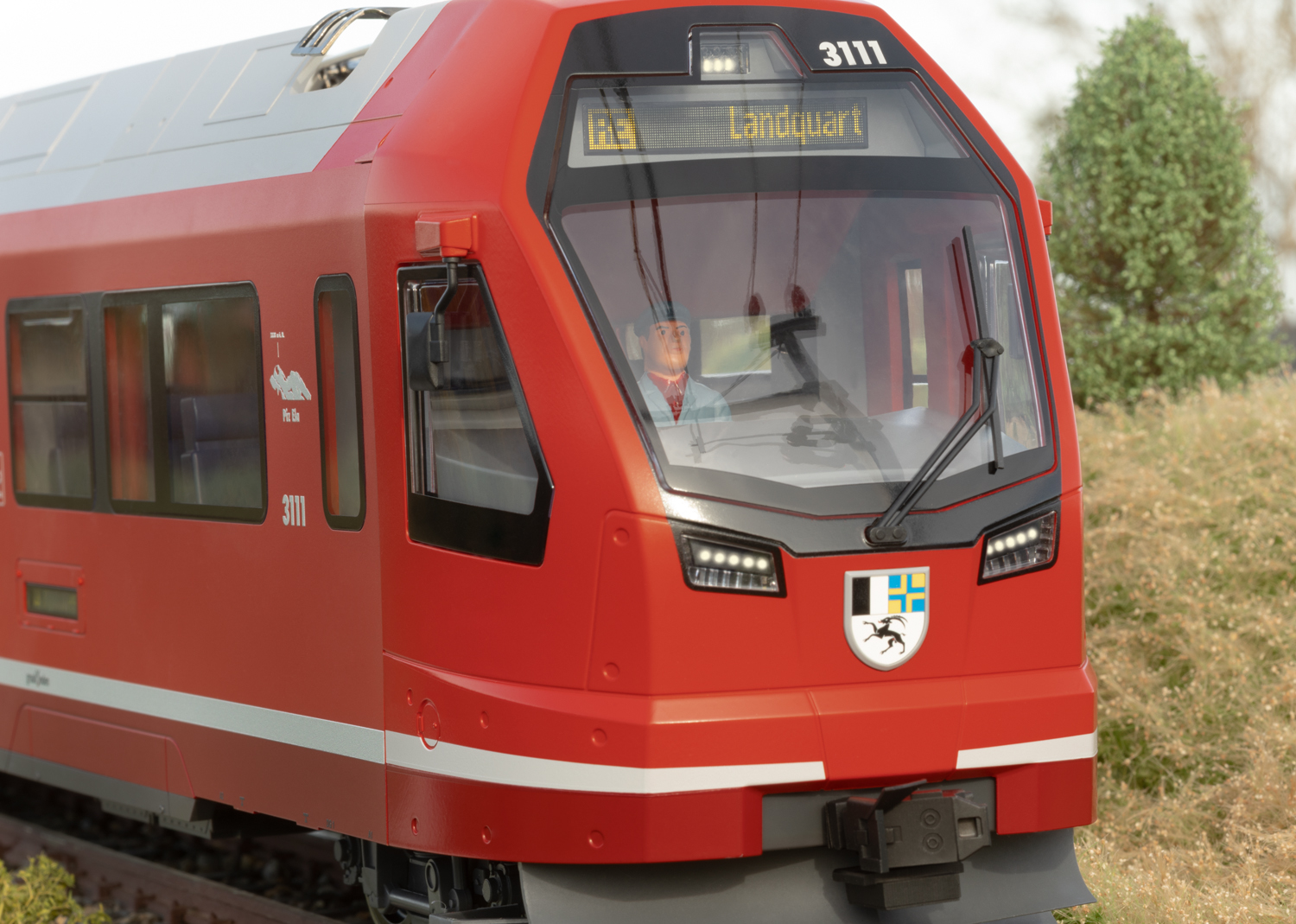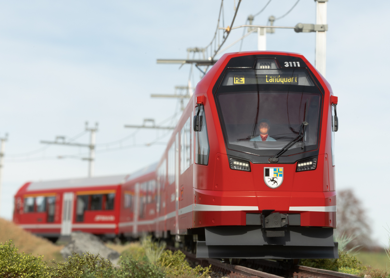 RhB Triebzug ABe 4/16 Capricorn Modell des Triebwagens und Steuerwagens des Triebzuges der Baureihe ABe 4/16 Capricorn der RhB. Originalgetreue Farbgebung und Beschriftung der Epoche VI. Angetrieben mit zwei kugelgelagerten Hochleistungsmotoren auf 4 Radsätzen, Haftreifen. Ausgerüstet mit einem mfx/DCC-Decoder mit vielen Sound- und Lichtfunktionen wie mit der Fahrtrichtung wechselndem Spitzenlicht, Innenbeleuchtung sowie im Digitalbetrieb schaltbarer Beleuchtung der Zugzielanzeigen und des beleuchteten Wappens von Graubünden. Fahrgeräusch auch im Analogbetrieb funktionsfähig. Pantographen auf dem Triebwagen digital ferngesteuert heb- und senkbar. Viele angesetzte Details, wie Leitungen, Steckdosen, Scheibenwischer, Antennen und Rückspiegel. Die beiden Fahrzeuge können mit den beiden Mittelwagen 33100 und 33150 zu einem vorbildgetreuen vierteiligen Zug ergänzt werden. Länge über Puffer 153 cm. Die ABe 4/16 sind vierteilige elektrische Triebzüge, von denen die Rhätische Bahn bei Stadler Rail insgesamt 56 Einheiten bestellt hat. Der Roll-out des ersten Zuges fand am 15. April 2019 im Stadler-Werk Altenrhein statt. Der erste Zug wurde am 27. Juni 2019 in Landquart abgeliefert und anschließend verschiedenen Tests unterzogen. Die RhB benennt die Züge nach dem Bündner Wappentier Steinbock als «Capricorn», was auch an dem beleuchteten Graubündner Wappen an den Stirnseiten zu erkennen ist.Die etwas über 76 Meter langen und 130 Tonnen schweren Züge tragen mit ihrer Leistung von 1.400 KW und ihrer Höchstgeschwindigkeit von 120 km/h zu einer Beschleunigung und Verdichtung des Personenverkehrs auf der RhB bei, nicht zuletzt durch die Möglichkeit, bis zu vier Triebzüge zu kuppeln. Dazu sind die Züge mit einer automatischen Mittelpufferkupplung ausgerüstet, da sie – im Gegensatz zum Allegra – nur im Personenverkehr eingesetzt werden und nicht für die Mitnahme von Güterwagen eingesetzt werden.Die Bestellung von diesen 56 Zügen mit einem Wert von 534 Millionen schweizer Franken stellt die größte Rollmaterialbestellung in der Geschichte der Rhätischen Bahn dar.In alter Tradition erhalten die Züge Namen von Bergen, so wurde der erste Zug mit der Nummer 3111 am 9. Oktober 2020 in Filisur auf den Namen äPiz Ela“ getauft. Seit dem Jahr 2021 sind immer mehr dieser Züge auf dem Netz der RhB – vor allem im Prättigau auf der Linie von Landquart nach Filisur – unterwegs. Mit den beiden Mittelwagen 33100 und 33150 kann der Zug zu einer vorbildgerechten vierteiligen Einheit erweitert werden. Fahrgeräusch auch im Analogbetrieb funktionsfähig. Komplette Neukonstruktion.mfx/DCC-Decoder.2 Hochleistungsmotoren.Spitzenlicht digital schaltbar.Wappenbeleuchtung digital schaltbar.Mit Sound.Stromabnehmer digital heb- und senkbar.Originalgetreue Farbgebung.Beleuchtete Zugzielanzeige.