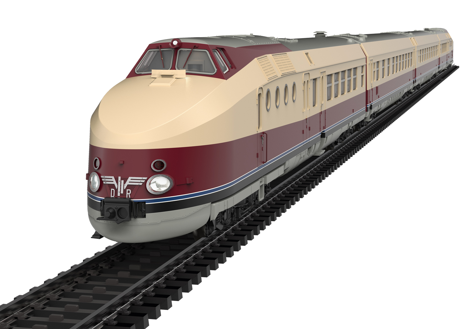 Diesel-Schnelltriebwagenzug VT 18.16 - Der VT 18.16 – ein Zug für Mitteldeutschland Elegant, schnell und luxuriös: Der Schnelltriebwagen der Bauart Görlitz stand einst für ein neues Reiseerlebnis auf Schienen. Er war das Prunkstück der Deutschen Reichsbahn der DDR, versprühte internationales Flair und er erfüllte nicht nur die Eisenbahner mit großem Stolz. Drei dieser elfenbein-roten Schienenstars sind erhalten geblieben. Seit 2003 gibt es aber kein betriebsfähiges Exemplar mehr, die schmucken Züge standen ungeschützt im Freien und es drohte ein langsamer Verfall. Dann traten ehemalige Reichsbahner und SVT-Fans auf den Plan und gründeten 2019 eine gemeinnützige gGmbH. Seither wird mit viel Herzblut und großem Sachverstand daran gearbeitet, einen kompletten Zug in altem Glanz erstrahlen zu lassen und als fahrende Legende erlebbar zu machen. Das Projekt steht unter dem Motto äEin Zug für Mitteldeutschland“ und soll die Verbundenheit mit der mitteldeutschen Region zum Ausdruck bringen. Und als äBotschafter in Europa“ wird dieser Renner an die große Zeit der luxuriösen internationalen Züge erinnern. Unternehmen Sie mit dem neuen Märklin-Modell eine Reise in eine Epoche, als schnittige Schnelltriebwagen wie der SVT Görlitz Zugläufe mit klangvollen Namen fuhren – als Neptun nach Kopenhagen, als Vindobona nach Wien und als Karlex in den Nobelkurort Karlsbad. Vorbild: Diesel-Schnelltriebwagenzug Baureihe VT 18.16 (Bauart SVT Görlitz), im Zustand der wiederaufbereiteten Museumsgarnitur durch die SVT Görlitz gGmbH. Angelehnt an die Ausführung der Deutschen Reichsbahn der DDR (DR/DDR) aus den 1960er und 1970er Jahren, als Aushängeschild für den internationalen Schnellverkehr. 4-teilige Einheit. 1 Triebkopf VTa, 1 Mittelwagen VMc mit Speiseraum und Küche, 1 Mittelwagen VMd, 1 Triebkopf VTb. Aktueller Betriebszustand ab 2025/26. Modell: 4-teilige Einheit. Mit Digital-Decoder mfx+ und umfangreichen Geräusch- und Lichtfunktionen. Geregelter Hochleistungsantrieb mit Schwungmasse in einem Triebkopf, alle vier Achsen über Kardan angetrieben. Haftreifen. Serienmäßig eingebaute LED-Innenbeleuchtung, Führerstandbeleuchtung, Führerpultbeleuchtung, Maschinenraumbeleuchtung, Beleuchtung Küchen-Bereich und Wandlampen im Speiseraum jeweils digital schaltbar. Fahrtrichtungsabhängig wechselndes Dreilicht-Spitzensignal, zwei rote Schlusslichter und Innenbeleuchtung konventionell in Betrieb, digital schaltbar. Gesamte Beleuchtung mit wartungsfreien warmweißen und roten Leuchtdioden (LED). Mehrteilige Inneneinrichtungen. Kulissengeführte mehrpolige stromführende Spezialkupplungen zwischen den Fahrzeugen. Schleiferumschaltung mit fahrtrichtungsabhängiger Stromversorgung über den jeweils vorderen Triebkopf. Mit Pufferspeicher. Viele angesetzte Details. An beiden Enden Nachbildung der automatischen Kupplung (ohne Funktion). Befahrbarer Mindestradius 360 mm. Länge der 4-teiligen Garnitur ca. 113 cm. Märklin unterstützt den Wiederaufbau dieses legendären Triebzuges mit einer Spende von 25.000,-- Euro. Dieses Modell finden Sie in Gleichstrom-Ausführung im Trix H0-Sortiment unter der Artikelnummer 25175.