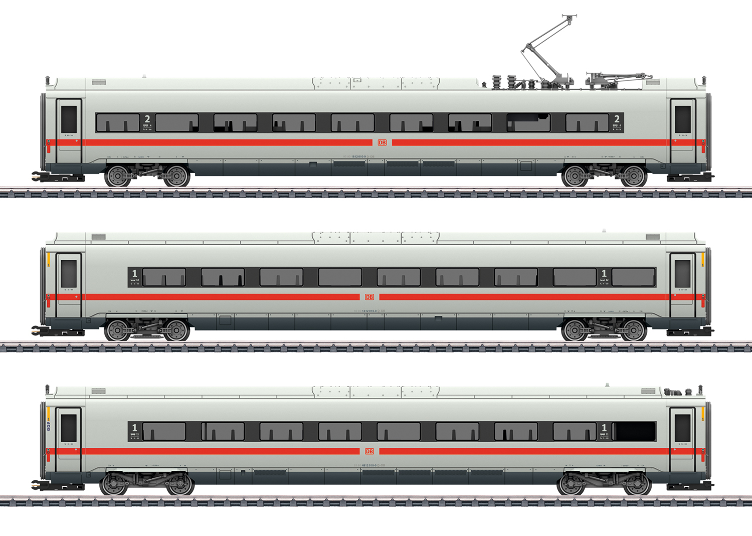 Modell: 3-teilige Ergänzung der Grundgarnitur zum ICE 4 im Längenmaßstab 1:95. Spezial-Kurzkupplungen mit Kulissenführung. Serienmäßig eingebaute LED-Innenbeleuchtung. Die Innenbeleuchtung wird versorgt über die durchgehende elektrische Verbindung des ganzen Zuges und ist nur funktionsfähig und digital schaltbar im Verbund mit der Grundgarnitur. Beide Pantographen auf einem Mittelwagen sind nur im Verbund mit der Grundgarnitur über den Decoder als Digital-Funktion separat heb- und senkbar. Gesamtlänge 90,5 cm.
