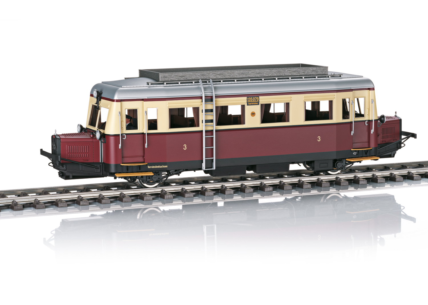 Modell: Komplette Neukonstruktion, Fahrgestell mit Hauptrahmen und Lokaufbau aus Metall. Viele angesetzte Messingteile bzw. angesetzte Metallteile wie Griffstangen, Metallschilder, Scheibenwischer etc. Mit DCC-Digital-Decoder, umfangreichen Geräuschfunktionen wie z.B. geschwindigkeitsabhängiges Fahrgeräusch, Typhon, Schaffnerpfiff, Geschichte des Vorbildfahrzeug uvm. Betrieb mit Wechselstrom, Gleichstrom, Märklin Digital und MFX möglich. Ein Hochleistungsmotor je Fahrzeughälfte mit Antrieb auf beide Achsen. Eingebauter parametrisierbarer Pufferkondensator.Warmweiß/rotes Led-Spitzensignal im Wechsel der Fahrtrichtung, konventionell in Betrieb, digital schaltbar. Instrumentenbeleuchtung schaltbar. Multihaltestellenansage je nach Variante mit vorbildgerechter Strecke. Türen motorisch zum Öffnen. Innenbeleuchtung schaltbar. Hochdetaillierte vorbildgerechte Inneneinrichtung, Führerstand 1 mit eingebauter Lokführerfigur. Befahrbarer Mindestradius 1.020 mm. Länge über Puffer 36,5 cm.Gewicht ca. 2,4 Kg. Dieseltriebwagen Cvt-34 äWismarer Schienenbus“ (Typ Hannover A), der DRG. Farbe Weinrot/Elfenbein, Epoche II (Zustand ab Ende 1935 bis 1947)Betriebsnummer VT 135 079, Saarbrücken.