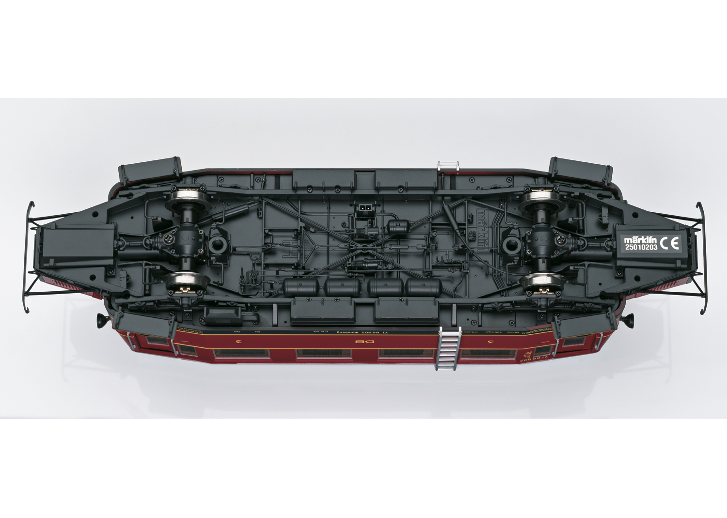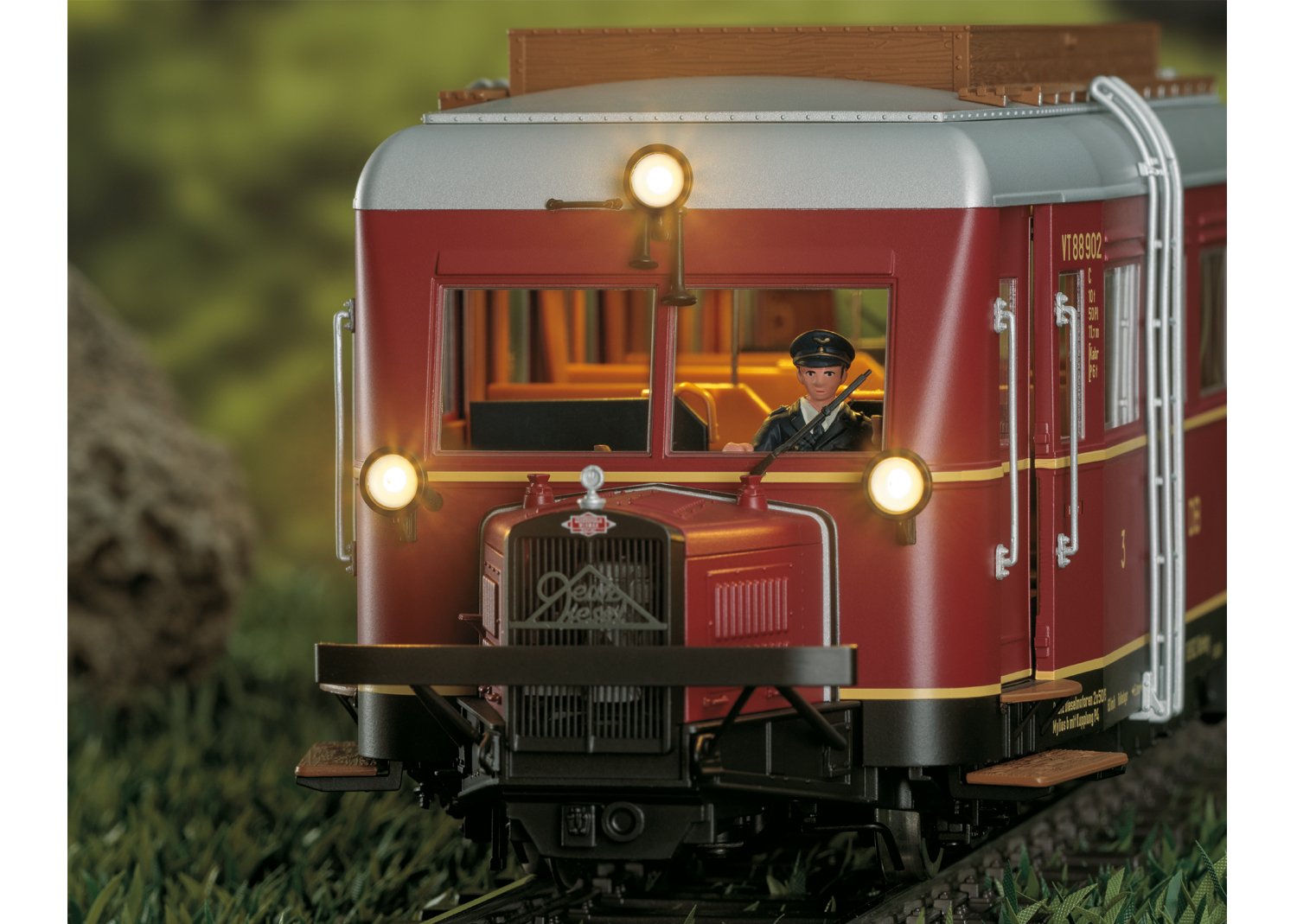 Modell: Komplette Neukonstruktion, Fahrgestell mit Hauptrahmen und Lokaufbau aus Metall. Viele angesetzte Messingteile bzw. angesetzte Metallteile wie Griffstangen, Metallschilder, Scheibenwischer etc. Mit DCC-Digital-Decoder, umfangreichen Geräuschfunktionen wie z.B. geschwindigkeitsabhängiges Fahrgeräusch, Typhon, Schaffnerpfiff, Geschichte des Vorbildfahrzeug uvm. Betrieb mit Wechselstrom, Gleichstrom, Märklin Digital und mfx möglich. Ein Hochleistungsmotor je Fahrzeughälfte mit Antrieb auf beide Achsen. Eingebauter parametrisierbarer Pufferkondensator. Warmweiß/rotes LED-Spitzensignal im Wechsel der Fahrtrichtung, konventionell in Betrieb, digital schaltbar. Instrumentenbeleuchtung schaltbar. Türen motorisch zum Öffnen. Multihaltestellenansage je nach Variante mit vorbildgerechter Strecke. Innenbeleuchtung schaltbar. Hochdetaillierte vorbildgerechte Inneneinrichtung, Führerstand 1 mit eingebauter Lokführerfigur. Befahrbarer Mindestradius 1.020 mm. Länge über Puffer 36,5 cm.Gewicht ca. 2,4 Kg. Dieseltriebwagen Cvt-34 äWismarer Schienenbus“ (Typ Hannover A) als VT 88.9 der DB. Farbgebung purpurrot, Epoche III (Zustand um 1950), VT 88 902, Nürnberg.