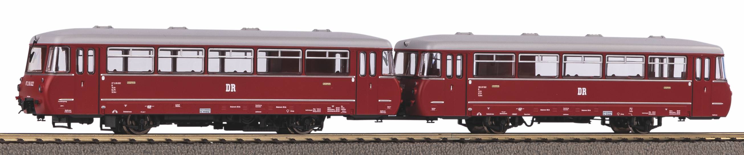 Mit dem neukonstruierten Modell des Schienenbusses VT 2.09 der Deutschen Reichsbahn entspricht PIKO einem oft genannten Wunsch vieler Modellbahner nach einer zeitgemäßen, detaillierten und auch betriebstauglichen Ausführung der bekannten "Ferkeltaxe". Nach der Entwicklung der innovativen Steuerungslogik des DB-Schienenbusses, für die PIKO das Goldene Gleis 2017 erhielt, liegt es nahe, nun auch das weitverbreitete Pendant aus Ostdeutschland detailverliebt mit einer entsprechenden Logik umzusetzen. Der Triebwagen wird von einem starken Kleinstmotor angetrieben, der zugunsten einwandfreier Laufeigenschaften mit Schwungmassen ausgestattet ist, und besitzt für optimale Fahreigenschaften ohne Soundunterbrechungen einen ab Werk eingebauten Pufferkondensator. Der Antrieb wirkt auf beide Achsen des Triebwagens. Trieb- und Steuerwagen sind über eine stromleitende Kurzkupplungskinematik miteinander kuppelbar. Die Beleuchtungsfunktionen beider Fahrzeuge sind gesondert schaltbar, der freie Durchblick durch die Fahrgasträume möglich. Das Triebfahrzeug registriert selbständig, ob ein Beiwagen beigefügt ist und schaltet dann zwischen den Fahrzeugen die Beleuchtung aus. Die PIKO "Ferkeltaxe" ist für eine unkomplizierte Nachrüstung mit Sound und größtmöglichem Lautsprecher vorbereitet.