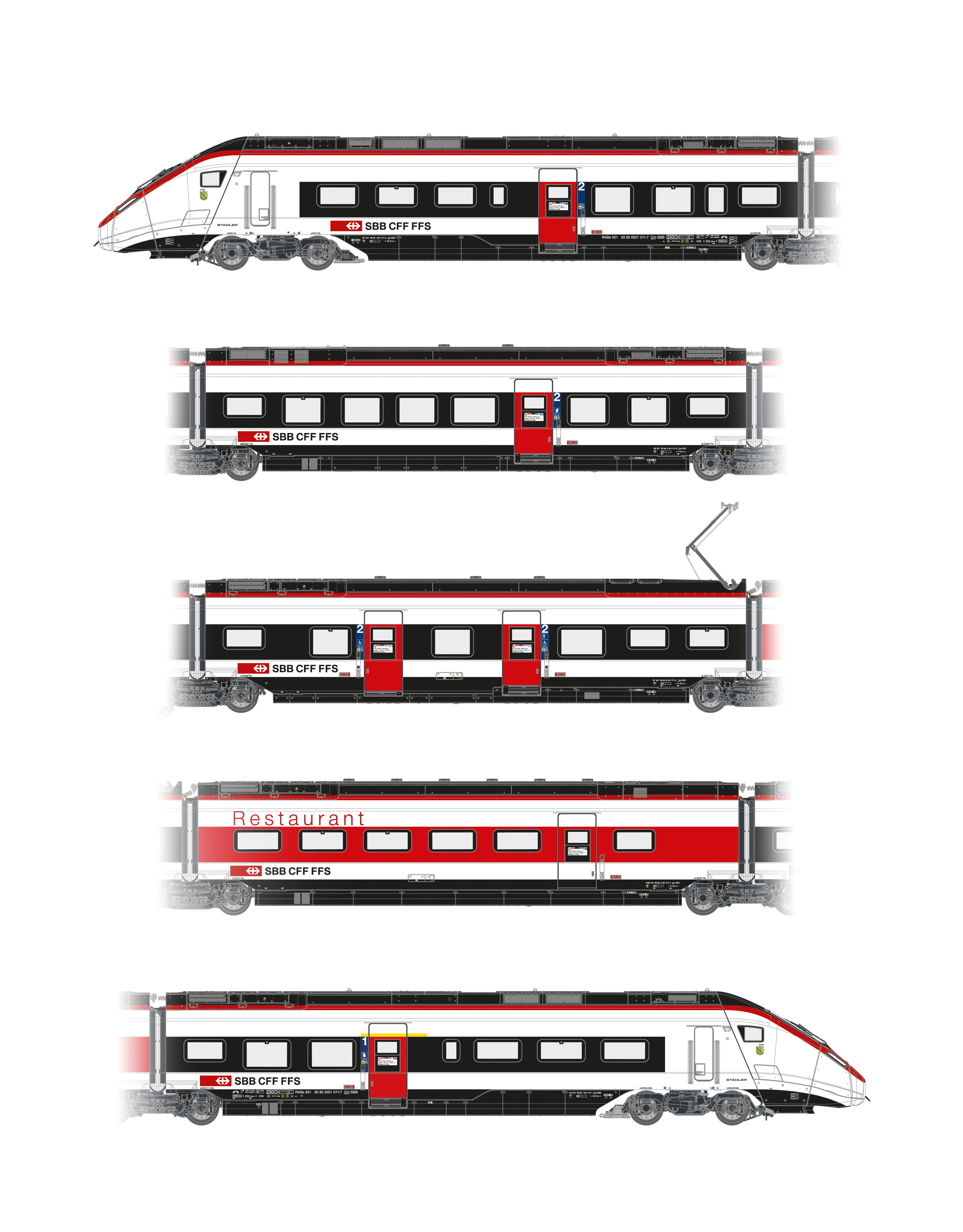 Ein Grundset bestehend aus den beiden Steuerwagen A (2. Klasse) und L (1. Klasse) und den Zwischenwagen G (Speisewagen), F (2. Klassewagen mit Rollstuhlbereich) und E (2. Klassewagen mit Familienbereich). Das 5-teilige Set ist im analogen und digitalen bereits voll funktionsfähig.