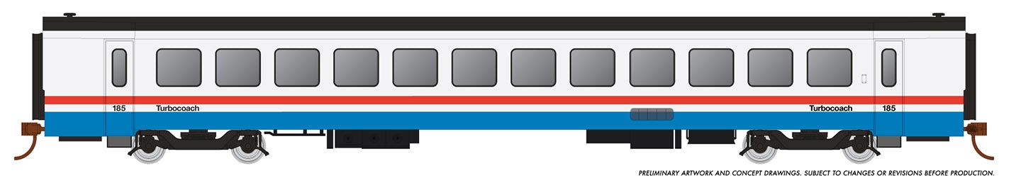 Turboliner Coach AMTK 185 - RTL Turboliner Coach - Ready to Run -- Amtrak 185 (Phase III Late, white, red, blue, black)