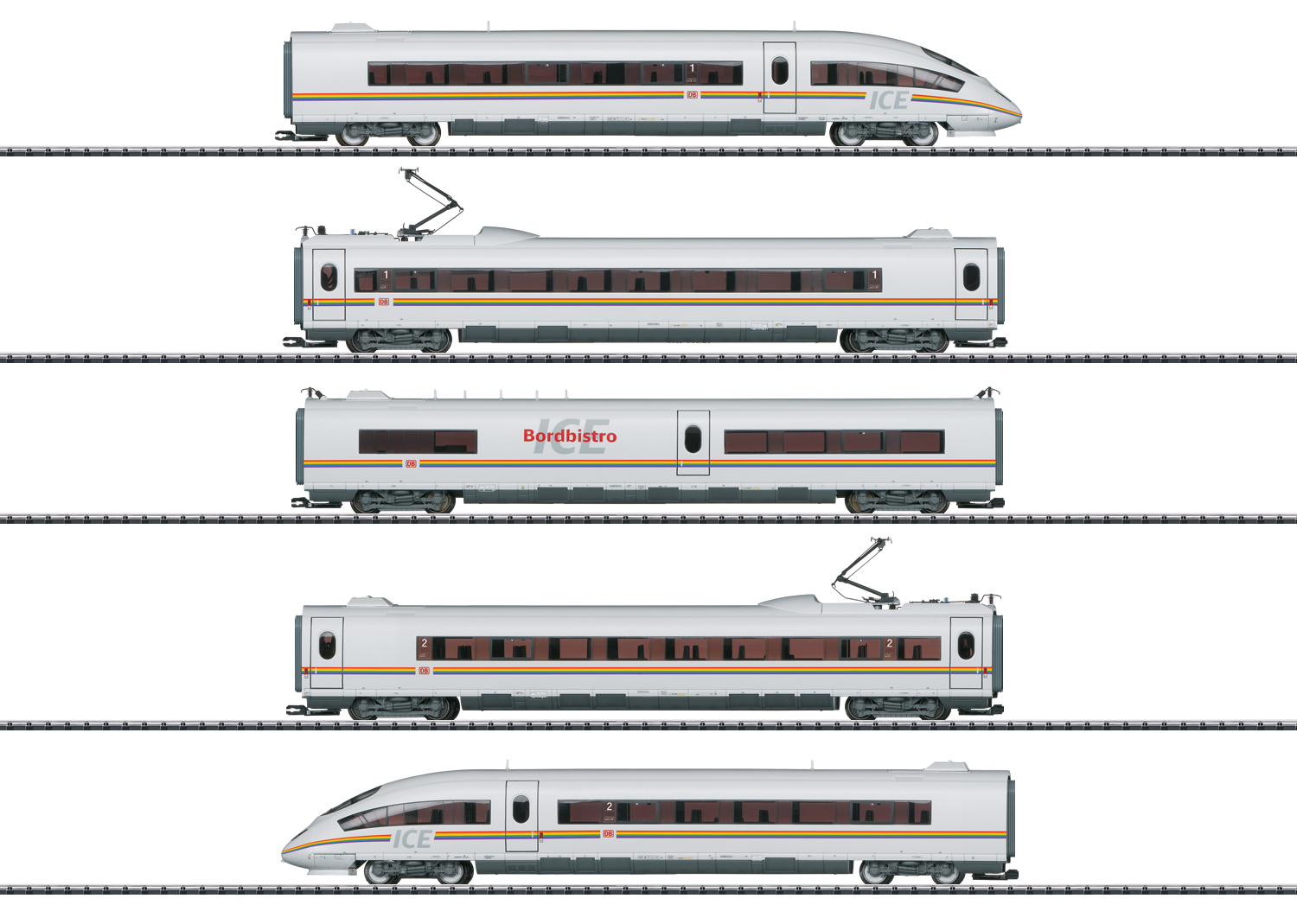 Vorbild: Hochgeschwindigkeitszug ICE 3, Baureihe 403 der Deutschen Bahn AG (DB AG). Ein Endwagen BR 403.0, 1. Klasse, ein Trafowagen BR 403.1, 1. Klasse, ein Speisewagen "Bordrestaurant" BR 403.3, ein Trafowagen BR 403.6, 2. Klasse und ein Endwagen BR 403.5, 2. Klasse. Triebzug Tz 304 mit dem Taufnamen "München" in Gestaltung mit regenbogenfarbenem Streifen als "railbow". Betriebszustand ab Juli 2021.