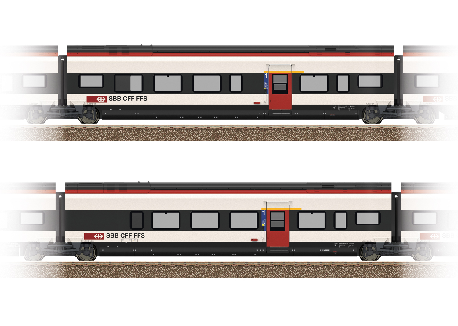 Ergänzungswagen-Set 3 zum RABe 501 Giruno - Modell: 2-teiliges Ergänzungswagen-Set zur Erweiterung des Hochgeschwindigkeits-Triebzuges RABe 501 Giruno auf eine 11-teilige Einheit. Serienmäßig eingebaute Innenbeleuchtung mit wartungsfreien warmweißen Leuchtdioden (LED). Die Innenbeleuchtung wird versorgt über die durchgehende elektrische Verbindung des ganzen Zuges und ist nur funktionsfähig und digital schaltbar im Verbund mit der Grundgarnitur. Beide Mittelwagen sind fest miteinander gekuppelt. Kulissenführung in den Jakobs-Drehgestellen. Maßstäbliche Nachbildung. Befahrbarer Mindestradius 360 mm. Länge des Wagen-Paares 40,2 cm. Vorbild: Ergänzungswagen für den Hochgeschwindigkeits-Triebzug RABe 501 Giruno der Schweizerischen Bundesbahnen (SBB). 1 Mittelwagen J (A4), 1. Klasse. 1 Mittelwagen K (A3), 1. Klasse. Aktueller Betriebszustand 2021. Die Grundgarnitur 25810 ist mit den Ergänzungswagen-Sets 23281, 23282 und 23283 auf eine vorbildgerechte 11-teilige Einheit erweiterbar. Dieses Ergänzungswagen-Set zum RABe 501 Giruno finden Sie in Wechselstromausführung im Märklin H0-Sortiment unter der Artikelnummer 43463. Komplette Neukonstruktion.Maßstäbliche Wiedergabe 1:87.Serienmäßig eingebaute LED-Innenbeleuchtung.