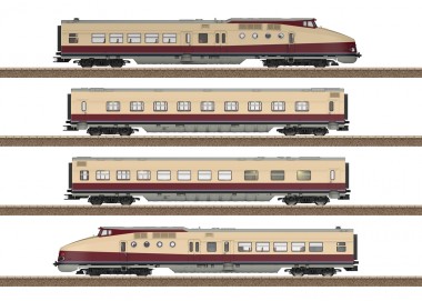 Diesel-Schnelltriebwagenzug VT 18.16 - Elegant, schnell und luxuriös: Der Schnelltriebwagen der Bauart Görlitz stand einst für ein neues Reiseerlebnis auf Schienen. Er war das Prunkstück der Deutschen Reichsbahn der DDR, versprühte internationales Flair und er erfüllte nicht nur die Eisenbahner mit großem Stolz. Drei dieser elfenbein-roten Schienenstars sind erhalten geblieben. Seit 2003 gibt es aber kein betriebsfähiges Exemplar mehr, die schmucken Züge standen ungeschützt im Freien und es drohte ein langsamer Verfall. Dann traten ehemalige Reichsbahner und SVT-Fans auf den Plan und gründeten 2019 eine gemeinnützige gGmbH. Seither wird mit viel Herzblut und großem Sachverstand daran gearbeitet, einen kompletten Zug in altem Glanz erstrahlen zu lassen und als fahrende Legende erlebbar zu machen. Das Projekt steht unter dem Motto äEin Zug für Mitteldeutschland“ und soll die Verbundenheit mit der mitteldeutschen Region zum Ausdruck bringen. Und als äBotschafter in Europa“ wird dieser Renner an die große Zeit der luxuriösen internationalen Züge erinnern. Unternehmen Sie mit dem neuen Trix-Modell eine Reise in eine Epoche, als schnittige Schnelltriebwagen wie der SVT Görlitz Zugläufe mit klangvollen Namen fuhren – als Neptun nach Kopenhagen, als Vindobona nach Wien und als Karlex in den Nobelkurort Karlsbad. Vorbild: Diesel-Schnelltriebwagenzug Baureihe VT 18.16 (Bauart SVT Görlitz), im Zustand der wiederaufbereiteten Museumsgarnitur durch die SVT Görlitz gGmbH. Angelehnt an die Ausführung der Deutschen Reichsbahn der DDR (DR/DDR) aus den 1960er und 1970er Jahren, als Aushängeschild für den internationalen Schnellverkehr. 4-teilige Einheit. 1 Triebkopf VTa, 1 Mittelwagen VMc mit Speiseraum und Küche, 1 Mittelwagen VMd, 1 Triebkopf VTb. Aktueller Betriebszustand ab 2025/26. Modell: 4-teilige Einheit. Mit Digital-Decoder und umfangreichen Geräusch- und Lichtfunktionen. Geregelter Hochleistungsantrieb mit Schwungmasse in einem Triebkopf, alle vier Achsen über Kardan angetrieben. Haftreifen. Serienmäßig eingebaute LED-Innenbeleuchtung, Führerstandbeleuchtung, Führerpultbeleuchtung, Maschinenraumbeleuchtung, Beleuchtung Küchen-Bereich und Wandlampen im Speiseraum jeweils digital schaltbar. Fahrtrichtungsabhängig wechselndes Dreilicht-Spitzensignal, zwei rote Schlusslichter und Innenbeleuchtung konventionell in Betrieb, digital schaltbar. Gesamte Beleuchtung mit wartungsfreien warmweißen und roten Leuchtdioden (LED). Mehrteilige Inneneinrichtungen. Kulissengeführte mehrpolige stromführende Spezialkupplungen zwischen den Fahrzeugen. Fahrtrichtungsabhängige Stromversorgung über den jeweils vorderen Triebkopf. Mit Pufferspeicher. Viele angesetzte Details. An beiden Enden Nachbildung der automatischen Kupplung (ohne Funktion). Befahrbarer Mindestradius 360 mm. Länge der 4-teiligen Garnitur ca. 113 cm. Märklin unterstützt den Wiederaufbau dieses legendären Triebzuges mit einer Spende von 25.000,-- Euro. Dieses Modell finden Sie in Wechselstrom-Ausführung im Märklin H0-Sortiment unter der Artikelnummer 38175.