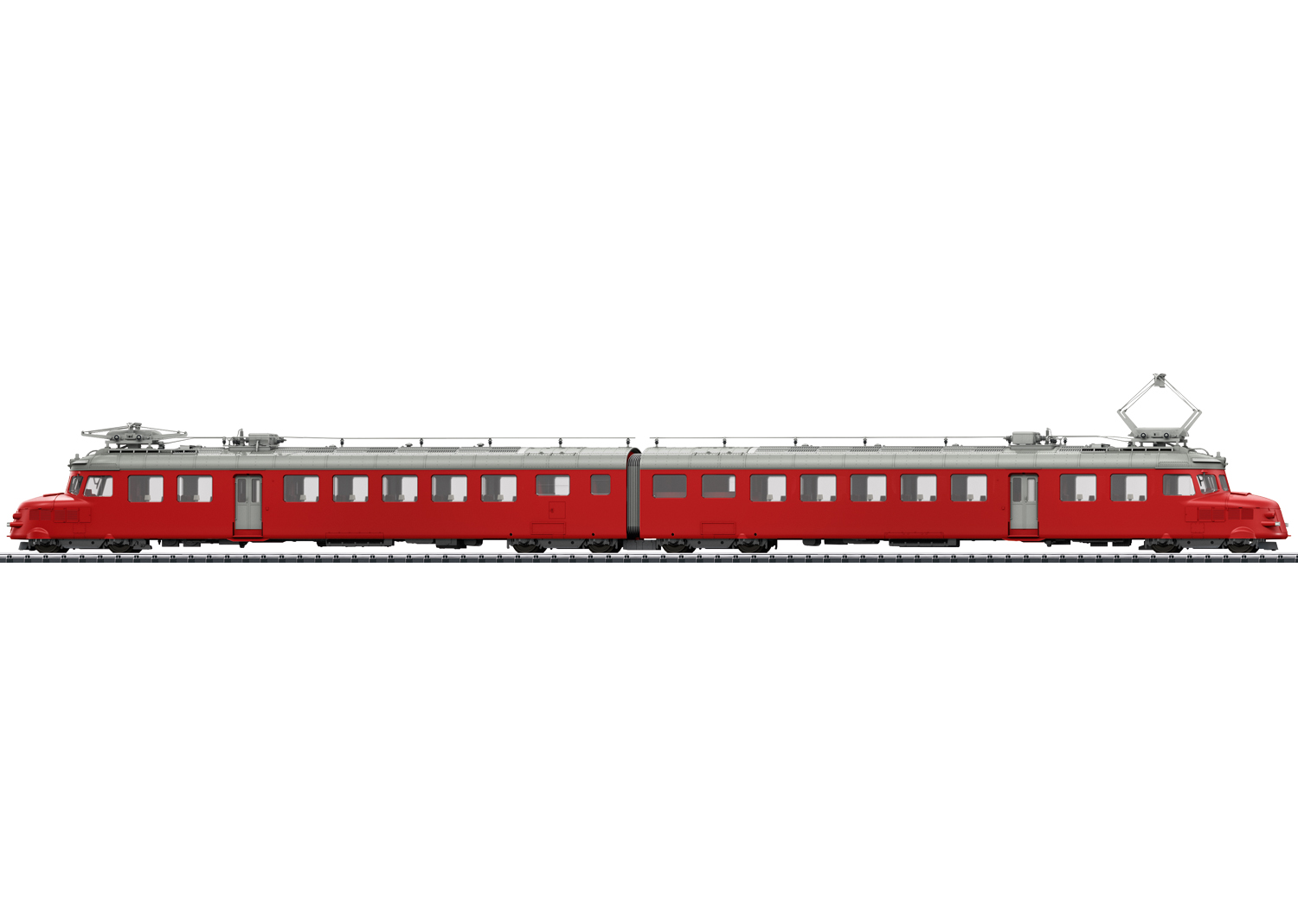 Mit Digital-Decoder und umfangreichen Geräusch- und Lichtfunktionen. Geregelter Hochleistungsantrieb mit Schwungmasse. Über Kardan werden die beiden Achsen im äußeren Drehgestell am Fahrzeugteil 1 angetrieben. Haftreifen. Schweizer Lichtwechsel, Dreilicht-Spitzensignal und 1 weißes Schlusslicht konventionell in Betrieb, digital schaltbar. Spitzensignal umschaltbar auf 1 rotes Schlusslicht. Zusätzlich rotes Fahrberechtigungssignal (Falschfahrsignal) jeweils in Fahrtrichtung vorne, digital schaltbar, mit der Fahrtrichtung wechselnd. Serienmäßig eingebaute Innenbeleuchtung konventionell in Betrieb, digital schaltbar. Führerstandbeleuchtung jeweils separat digital schaltbar. Tischlampen digital schaltbar. Beleuchtung mit wartungsfreien warmweißen und roten Leuchtdioden (LED). Vier Drehgestell-Blenden liegen zum Austausch für den Einsatz auf großen Radien oder für die Vitrine bei. Gesamtlänge über Puffer ca. 53 cm.