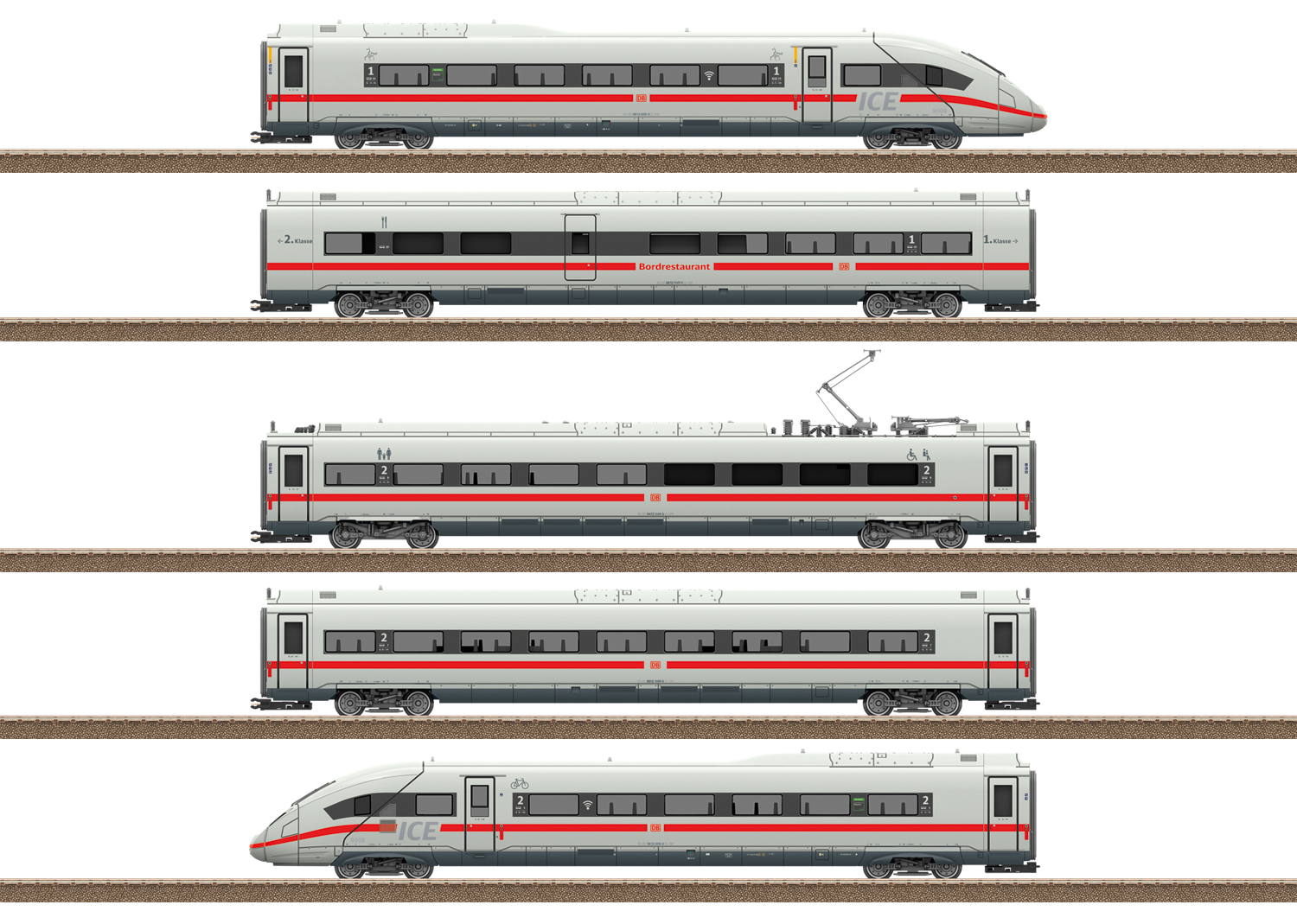 Vorbild: Hochgeschwindigkeitszug ICE 4 als Baureihe 412/812 der Deutschen Bahn AG (DB AG), 1 Endwagen EW 1.2-H, Baureihe 812, 1. Klasse. 1 Speisewagen RW Bordrestaurant, Baureihe 812, 1. Klasse. 1 Servicewagen TW 2.2, Baureihe 412, 2. Klasse. 1 Mittelwagen MW 2-H, Baureihe 812, 2. Klasse. 1 Endwagen EW 2.2-H, Baureihe 812, 2. Klasse. Betriebszustand 2019.