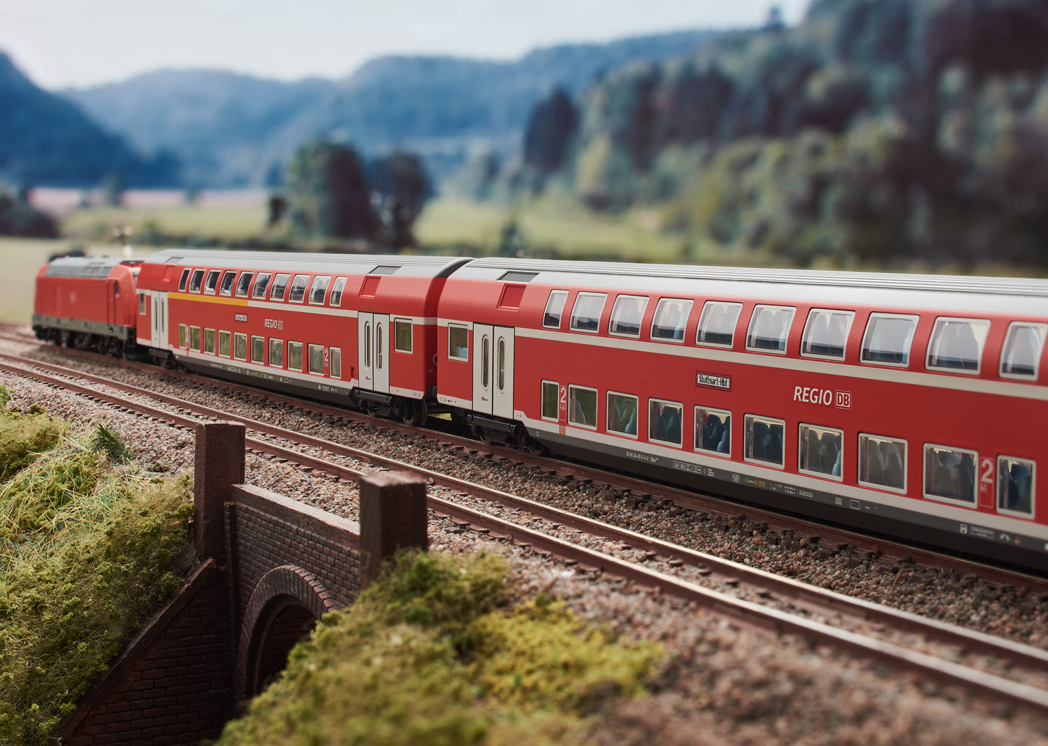 Vorbild: Eine dieselelektrische Streckenlokomotive angelehnt an die Baureihe 245, ein Doppelstockwagen der 1./2. Klasse und ein Doppelstockwagen der 2. Klasse der Deutschen Bahn AG (DB AG). Betriebszustand um 2013.