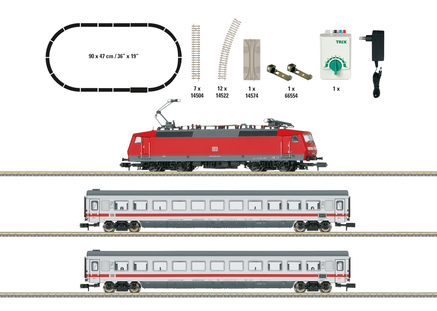 Modell: Lokomotive mit digitaler Schnittstelle. 5-poliger Motor mit Schwungmasse. 4 Achsen angetrieben. Spitzensignal und Schlusslichter mit LED, mit der Fahrtrichtung wechselnd, mit Kinematik für Kurzkupplung. Wagen mit Kinematik für Kurzkupplung und nachrüstbar mit 66616 LED-Innenbeleuchtung. Gesamtlänge des Zuges 450 mm. Fahrgerät mit Schaltnetzteil und Anschlussmaterial. Gleisoval mit gebogenen Gleisen im Radius 2. Benötigte Grundfläche: 110 x 50 cm.