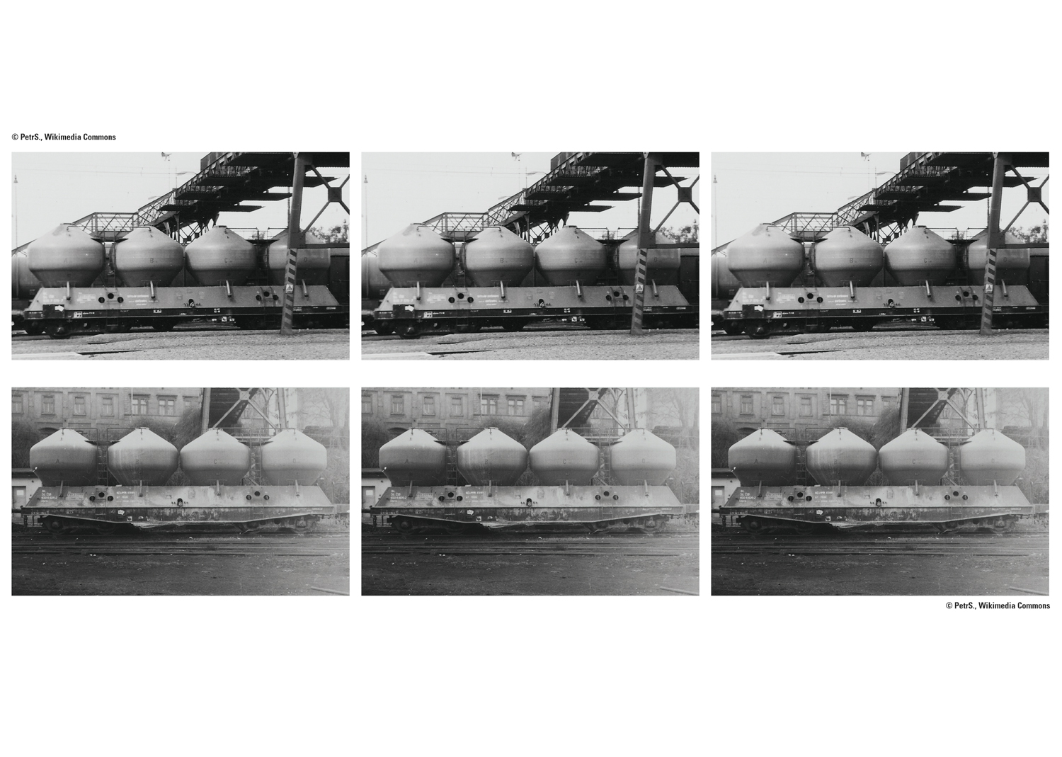 Modell: Neukonstruktion. Mit Kinematik für Kurzkupplung, Drehgestelle Typ Y 25. Vorbild: 6 vierachsige Silowagen der Bauart Uacs der der Bahngesellschaft ?eskoslovenské Stßtní Drßhy (?SD). 3 Silowagen in der Ausführung mit Schürze (mossgrüner Kastenaufbau). Alle Wagen mit melonengelben Behältern. Betriebszustand um 1974. Neukonstruktion.