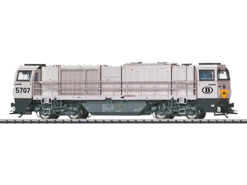 DCC Sound. Vorbild: Schwere Diesellokomotive Vossloh G 2000 BB mit symetrischem Führerhaus. Lokomotive der ATC AngelTrainsCargo, Antwerpen, als Serie 57 vermietet an die Belgischen Staatsbahnen (SNCB). Lichtgrau/grüne Grundfarbgebung mit umbragrauem Rahmen. Lok-Betriebsnummer 5707. Betriebszustand um 2011. Modell: Mit Digital-Decoder und umfangreichen Geräusch- und Lichtfunktionen. Geregelter Hochleistungsantrieb mit Schwungmasse zentral eingebaut. Alle 4 Achsen über Kardan angetrieben. Haftreifen. Fahrtrichtungsabhängig wechselndes Dreilicht-Spitzensignal und 2 rote Schlusslichter konventionell in Betrieb, digital schaltbar. Spitzensignal an Lokseite 2 und 1 jeweils separat digital abschaltbar. Wenn Spitzensignal an beiden Lokseiten abgeschaltet ist, dann beidseitige Funktion des Doppel-A-Lichtes. Führerstandbeleuchtung pro Führerstand jeweils separat digital schaltbar. Beleuchtung mit wartungsfreien warmweißen und roten Leuchtdioden (LED). Viele separat angesetzte Details. Längsseitige Geländer am Rahmen aus Metall. Detaillierte Pufferbohle. Ansteckbare Bremsschläuche liegen bei. Beiliegende Frontabdeckungen können zusätzlich an der Pufferbohle montiert werden. Länge über Puffer 20 cm. Highlight: Fahrgestell und Teile des Aufbaues aus Metall. Führerstandbeleuchtung separat digital schaltbar. Mit Digital-Decoder und umfangreichen Betriebs- und Geräuschfunktionen.