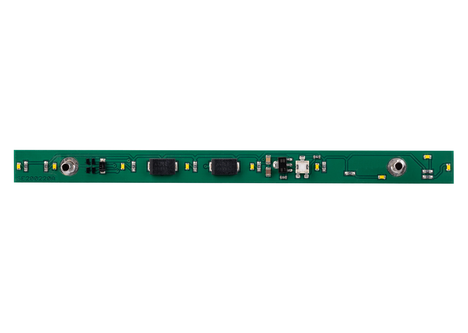 LED-Innenbeleuchtung - Für Minitrix Personenwagen mit einer Länge über Puffer von 165 mm (Ausnahme sind Personenwagen auf Basis der Silberlinge) und mit Stromaufnahme von jeweils einem Leiter je Drehgestell. Mit Anschlußbuchse für Personenwagen mit beleuchtetem Zugschlusssignal ab dem Produktionsjahr 2025. Bestehend aus einer LED-Lichtleiste (warmweiß) und Schleiferfedern. Die LED-Lichtleiste ist mit einem Elko zur Energiepufferung (Flackerschutz) und einem Dimmer (Poti) ausgestattet.