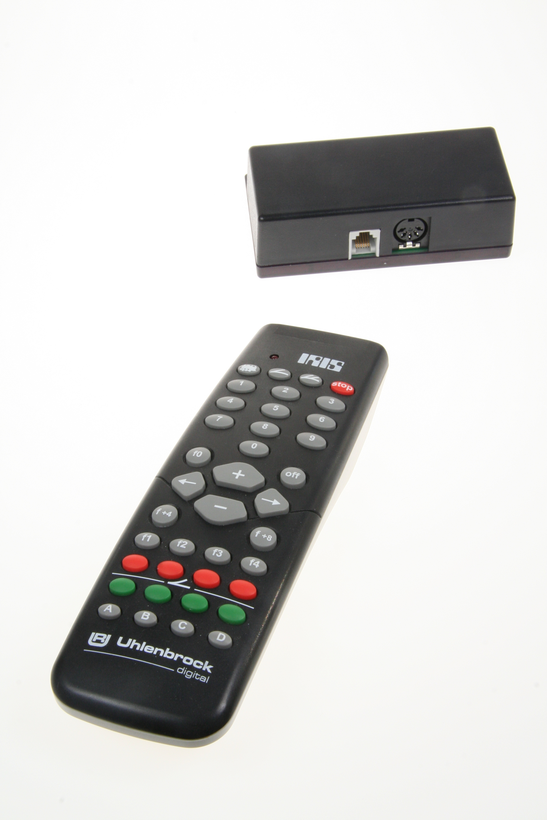 Mit dem LocoNet IR-Set können mit jeder LocoNet-Digitalzentrale Loks, Weichen und Fahrstraßen drahtlos gesteuert werden. Einfach den LocoNet IR-Emfänger mit dem LocoNet verbinden und mit bis zu vier verschiedenen Handsendern IRIS alles auf der Anlage steuern. Mit diesem Empfänger können Sie die IR-Fernbedienung IRIS oder PIKO Digi-Fern auch mit IB-Basic, IB-Com, DAISY und dem ProfiBoss benutzen. IRIS benutzt zur Steuerung vier verschiedene übermittlungskanäle, die über die Tasten A, B, C oder D angewählt werden können. Mit jedem übermittlungskanal kann unabhängig von den anderen Kanälen eine Lokadresse zur Steuerung ausgewählt werden. Ferner können in jedem Kanal den Magnetartikeltasten andere Magnetartikeladressen zugeordnet werden. Die pro Kanal ausgewählten Adressen werden in dem LocoNet IR-Empfänger dauerhaft gespeichert und stehen somit auch nach dem Aus- und wieder Einschalten zur Verfügung. Wird nur eine Fernbedienung benutzt, so kann mit Hilfe der Kanaltasten schnell zwischen der Steuerung von vier Lokomotiven und vier Gruppen von je vier Magnetartikeln gewechselt werden. Werden mehrere Fernbedienungen benutzt, so kann jeder Spieler über einen übermittlungskanal eine Lok steuern, ohne die Loks der anderen Mitspieler zu beeinflussen, die auf die anderen übermittlungskanäle eingestellt sind. Die Fernbedienung hat vier verschiedene Kanäle und ermöglicht so den Betrieb von vier Sendern in einem Raum.