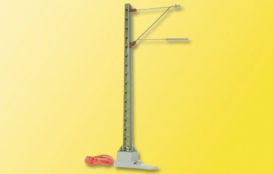 Der Anschlussmast hat eine geteilte Ausführung der oberen Fahrdrahtaufnahme, wodurch die Fahrstrecken unterschiedlichen Stromquellen zugeteilt werden können. Dadurch lassen sich einzelne Abschnitte stromlos schalten, so dass ein Blockbetrieb realisiert werden kann. Mit Ausleger und Anschlusskabel, filigrane Metallausführung. Mittlere Auslage: 3,4 cm. Höhe: 9,9 cm.
