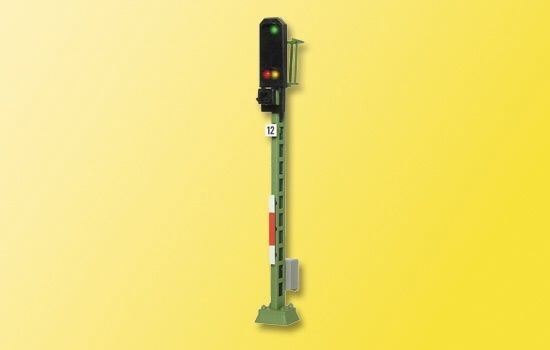 Signal der Einheitsbauart. Filigraner Messingmast in originalgetreuer Lackierung. Patentsteckfuß für einfache Montage. Mit 3 LEDs, wartungsfrei. Signalbilder Hp0, Hp1 und Hp2. Passendes Steuermodul: Art. 5222. Höhe: 4,4 cm.