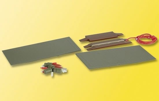 Zum Verlängern der Schrankenbäume von Art. 5100. Bestehend aus je einem Gleisfüllstück für Zwei- und Mittelleitergleis, je 6 roten und weißen Schrankenverlängerungen, 2 Auffahrrampen, 4 Rampenfüßen und 2 Ausgleichsfedern.