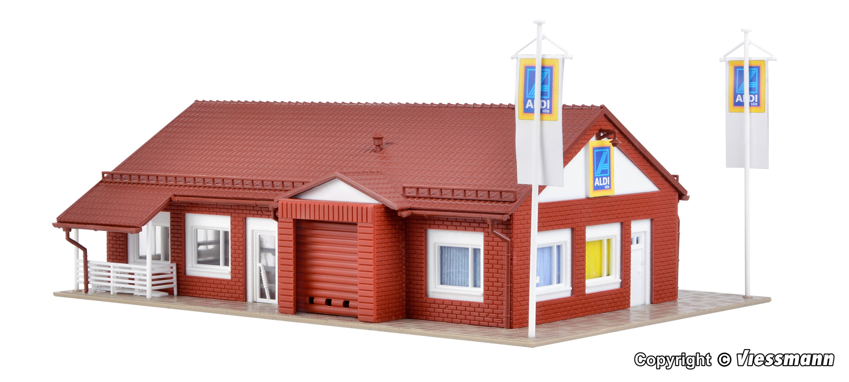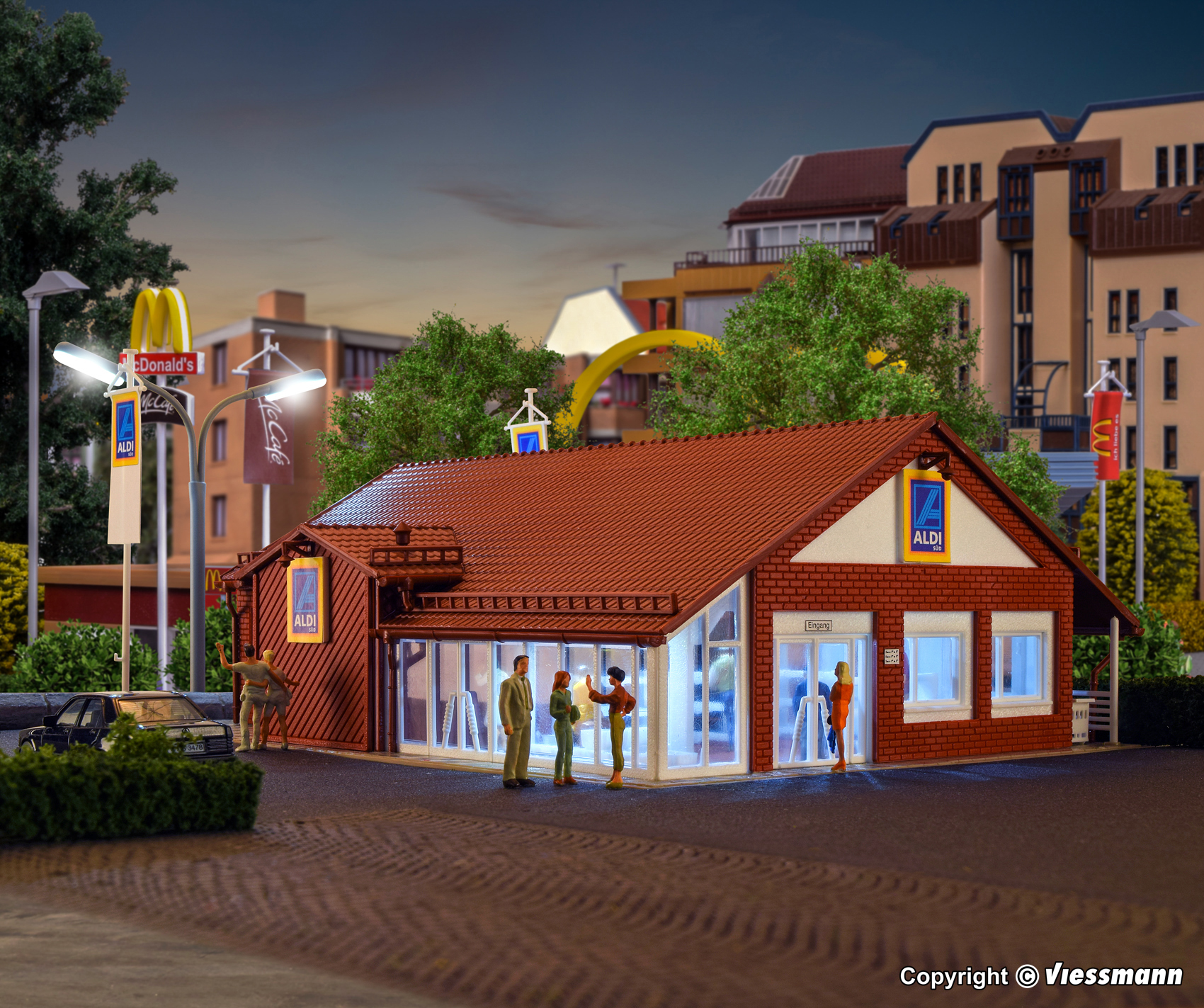 Dieser Markt ist mit einer passenden Ladeneinrichtung ausgestattet. Maße: L 20 x B 14,8 x H 9 cm.