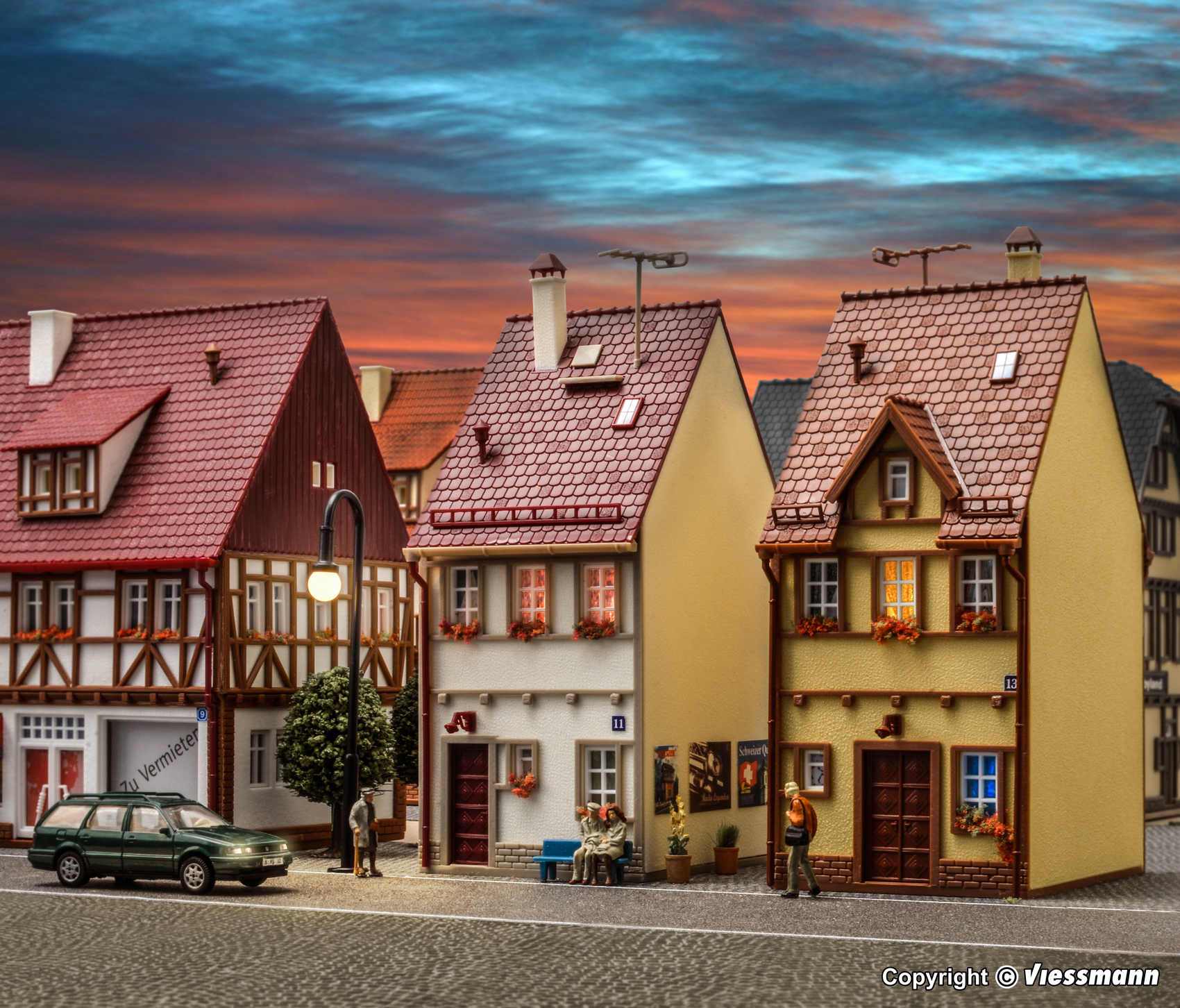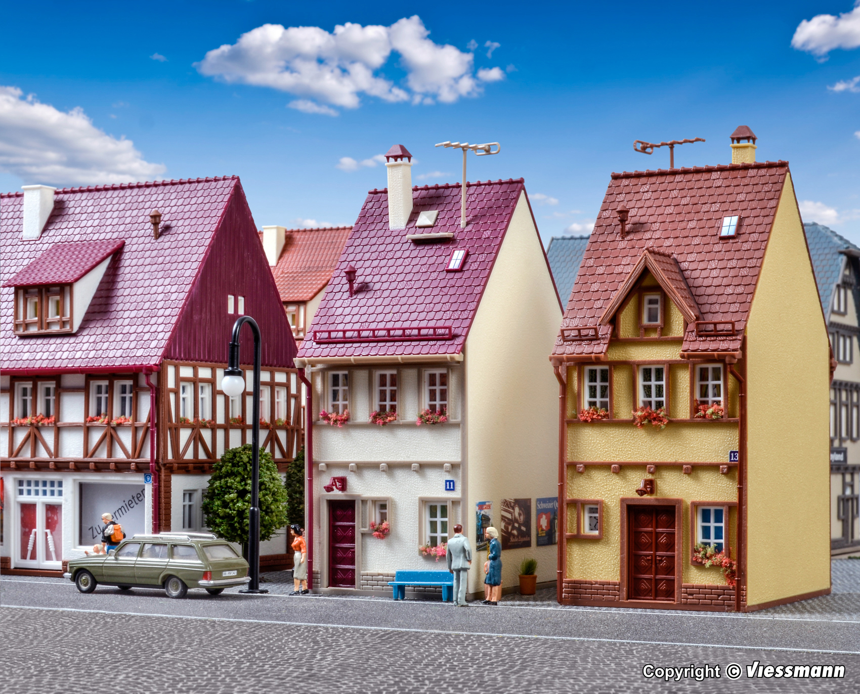 Mit den Bausätzen der Vollmer Bahnhofstraße 9 ? 19 können Sie einen kompletten Straßenzug mit Wohn-, Geschäfts- und Fachwerkhäusern gestalten. Bereits mit 4 Bausätzen schaffen Sie sich eine preiswerte und abwechslungsreiche Häuserfront. Maße: L 8,3 x B 5,2 x H 13 cm.