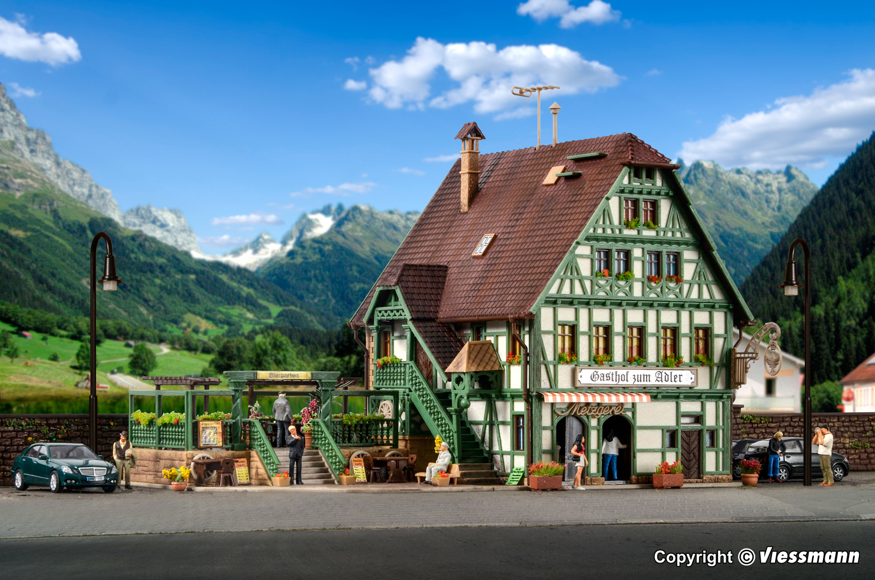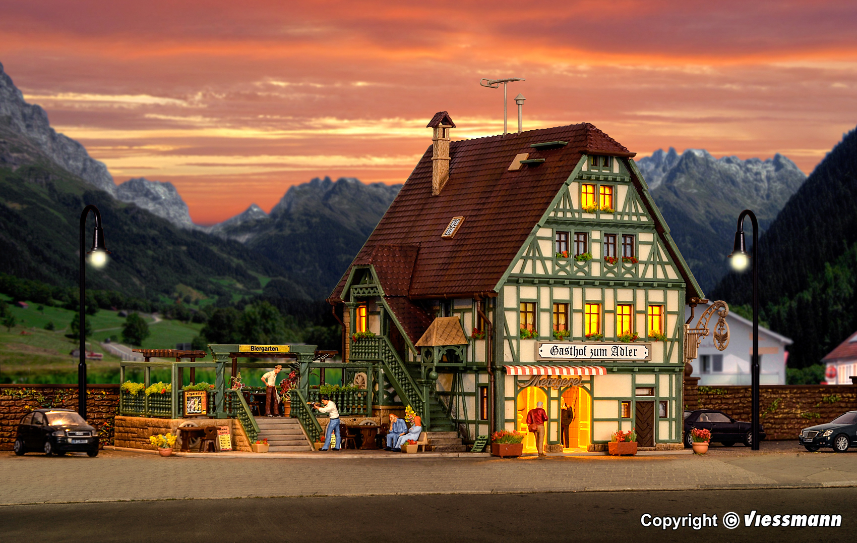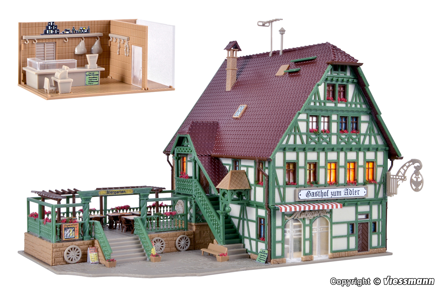 Dieser Bausatz ist mit umfangreichem Zubehör ausgestattet. Neben der passenden LED-Beleuchtung für den Innenraum liegen dem Bausatz Tische und Bänke für den angeschlossenen Biergarten und eine Ladeneinrichtung für die Metzgerei bei. Maße: L 21 x B 15 x H 15 cm.