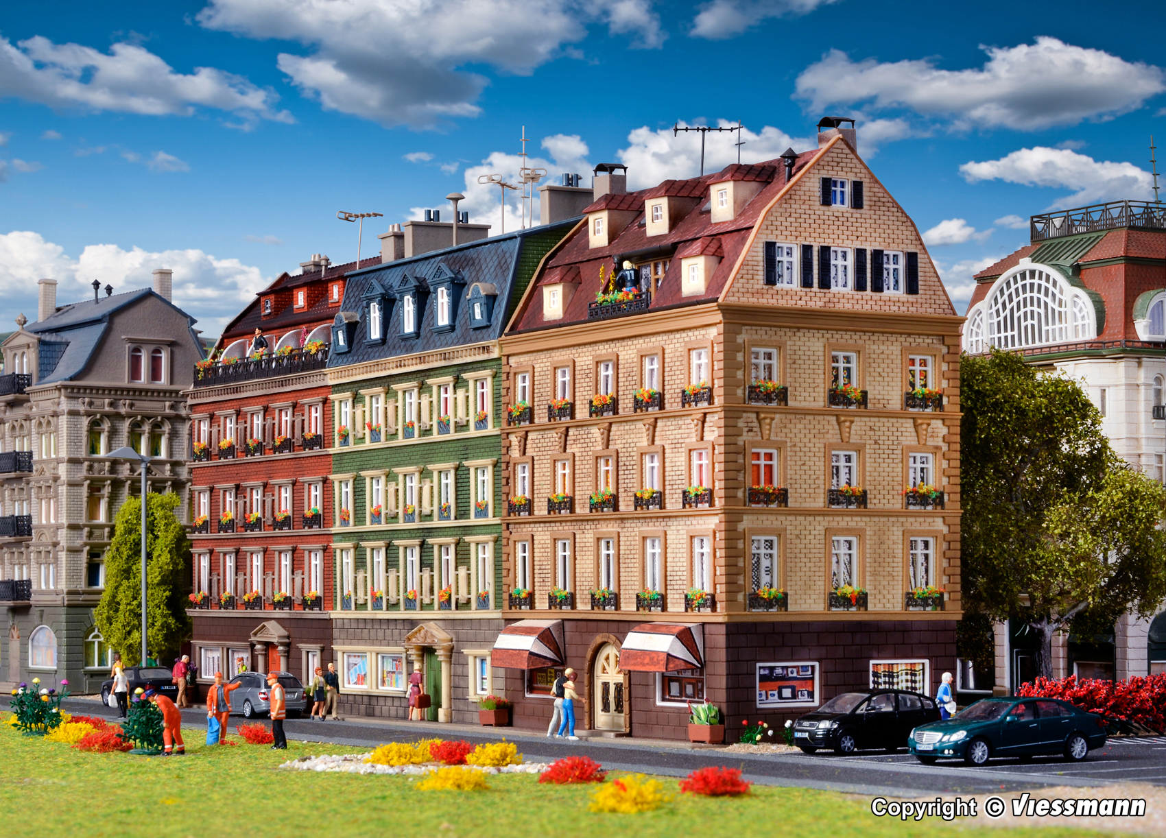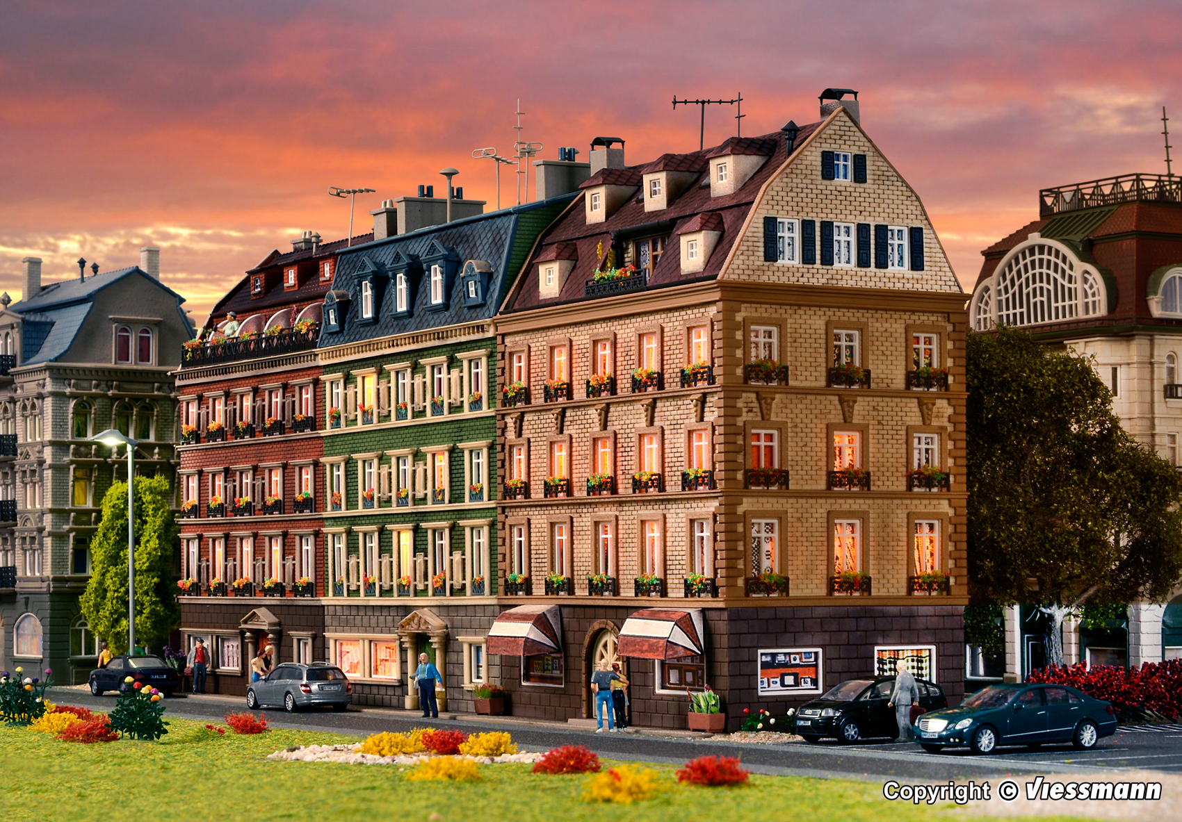 Mit diesem Häuserblock können Sie einen ganzen Straßenzug gestalten. Die Gebäude sind mit vielen Details ausgestattet, z. B. Eisengitterverzierungen, zierlichen Balkonen, Dachterrassen und vielem mehr. Maße: L 39,6 x B 10,6 x H 20,5 cm.