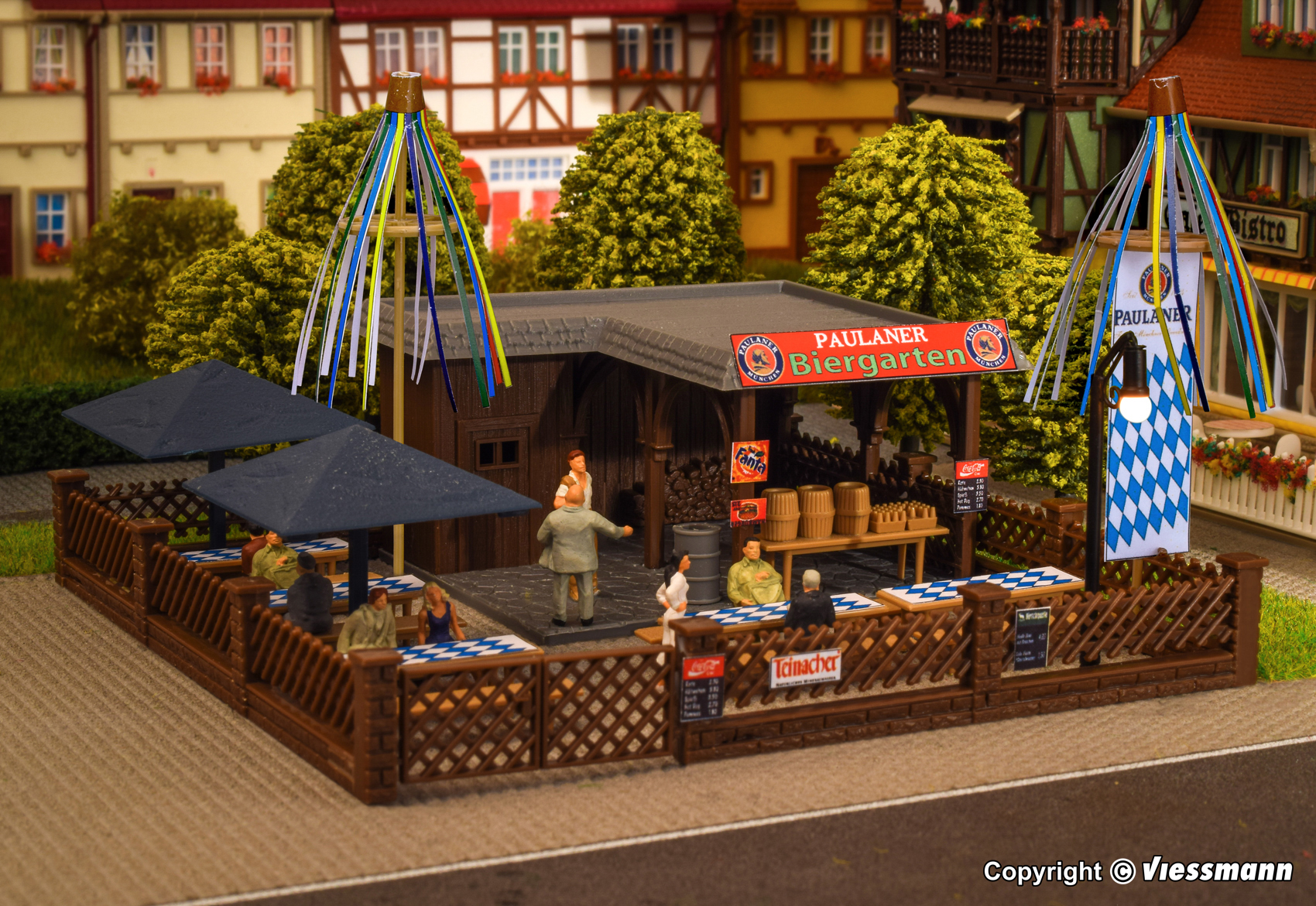 So ein Biergarten macht einfach Lust auf eine gemütliche Pause im Grünen mit leckeren Spezialitäten, einem frischen Bier und netten Leuten. Hier wurde wirklich an alles gedacht! Schirme, Tische und Bänke, Bierfässer und weitere Details zur Ausgestaltung liegen dem Bausatz bei. Maße Zaun: L 12,5 x B 12,5 x H 1,2 cm, Gebäude: L 7,8 x B 7 x H 4 cm.